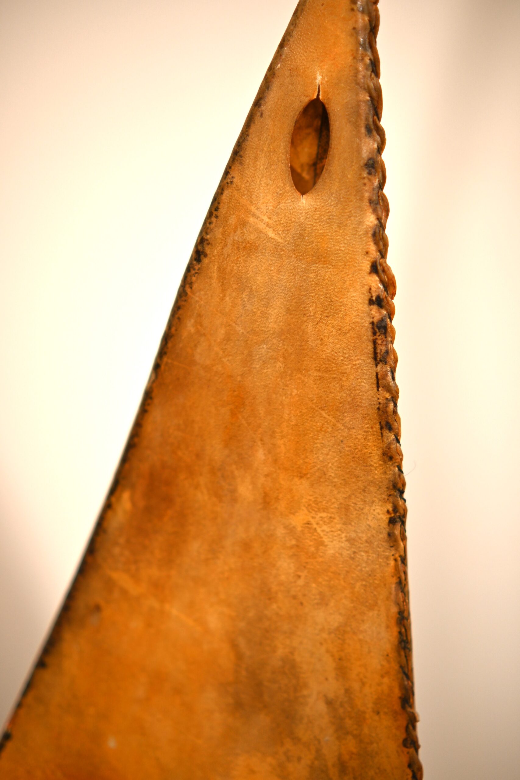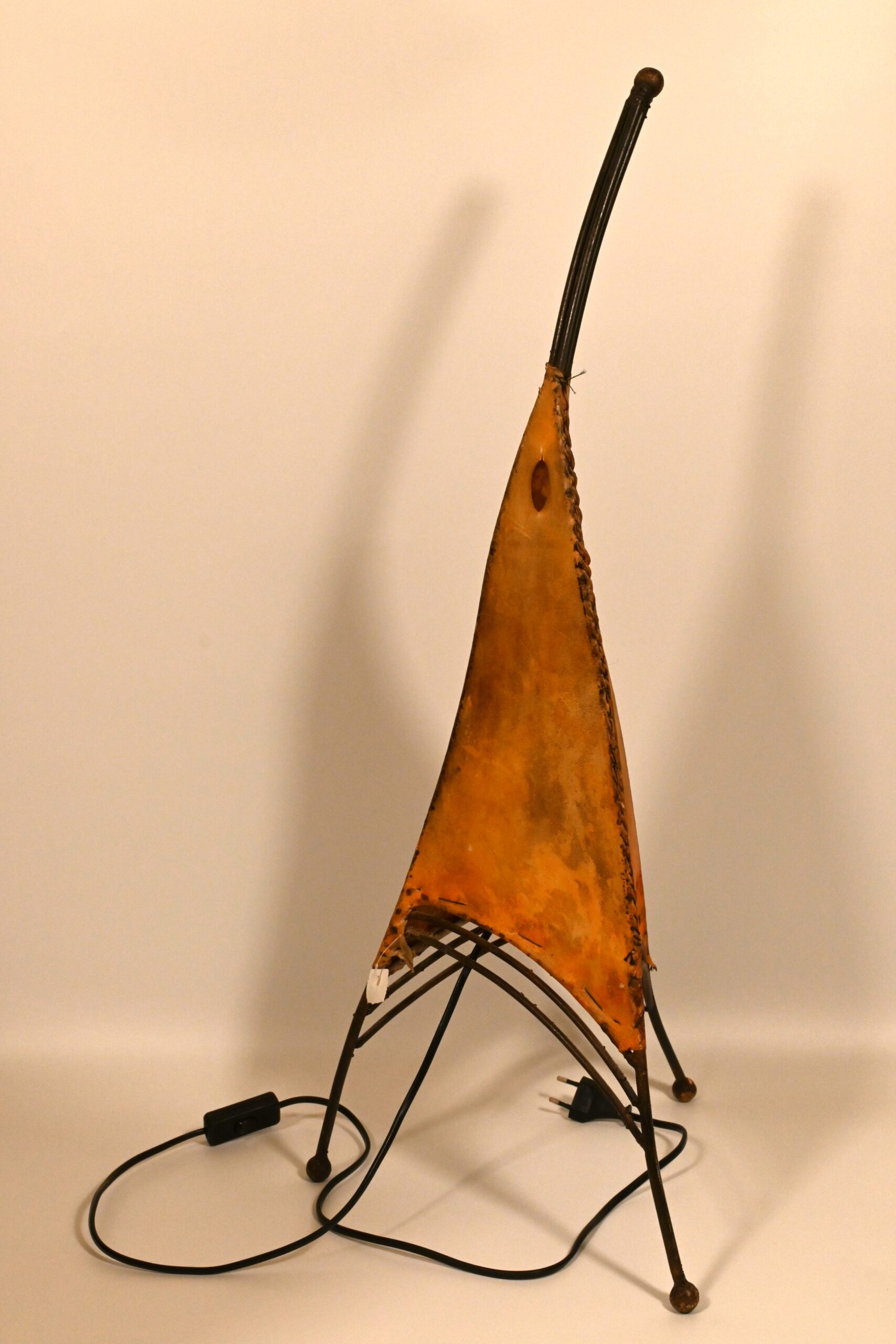 Lampa w stylu vintage z nietypowym, skórzanym abażurem i metalowym stojakiem. Wykonana ręcznie. Rozmiar skórzanego klosza: wysokość-40cm, szerokość-22cm.