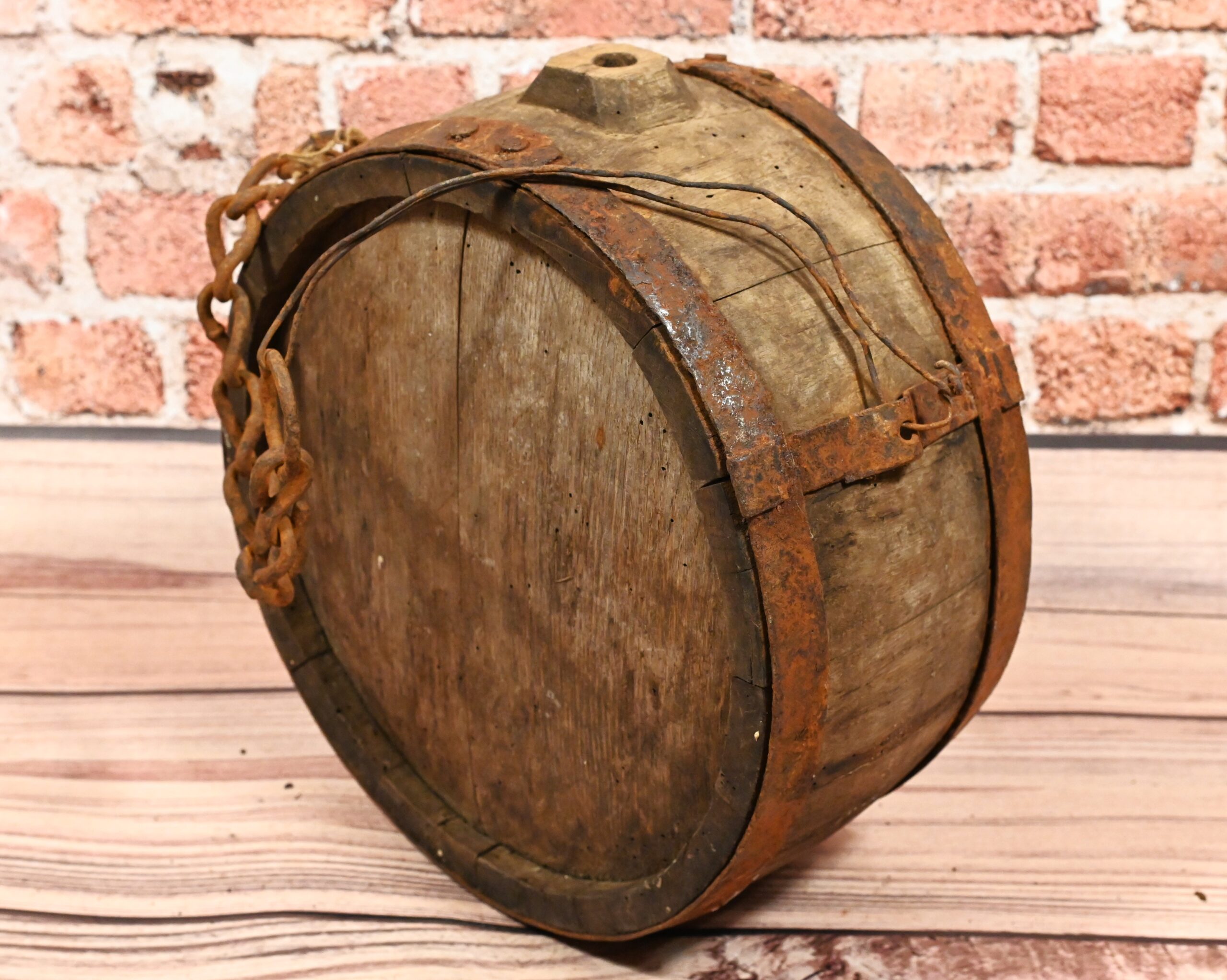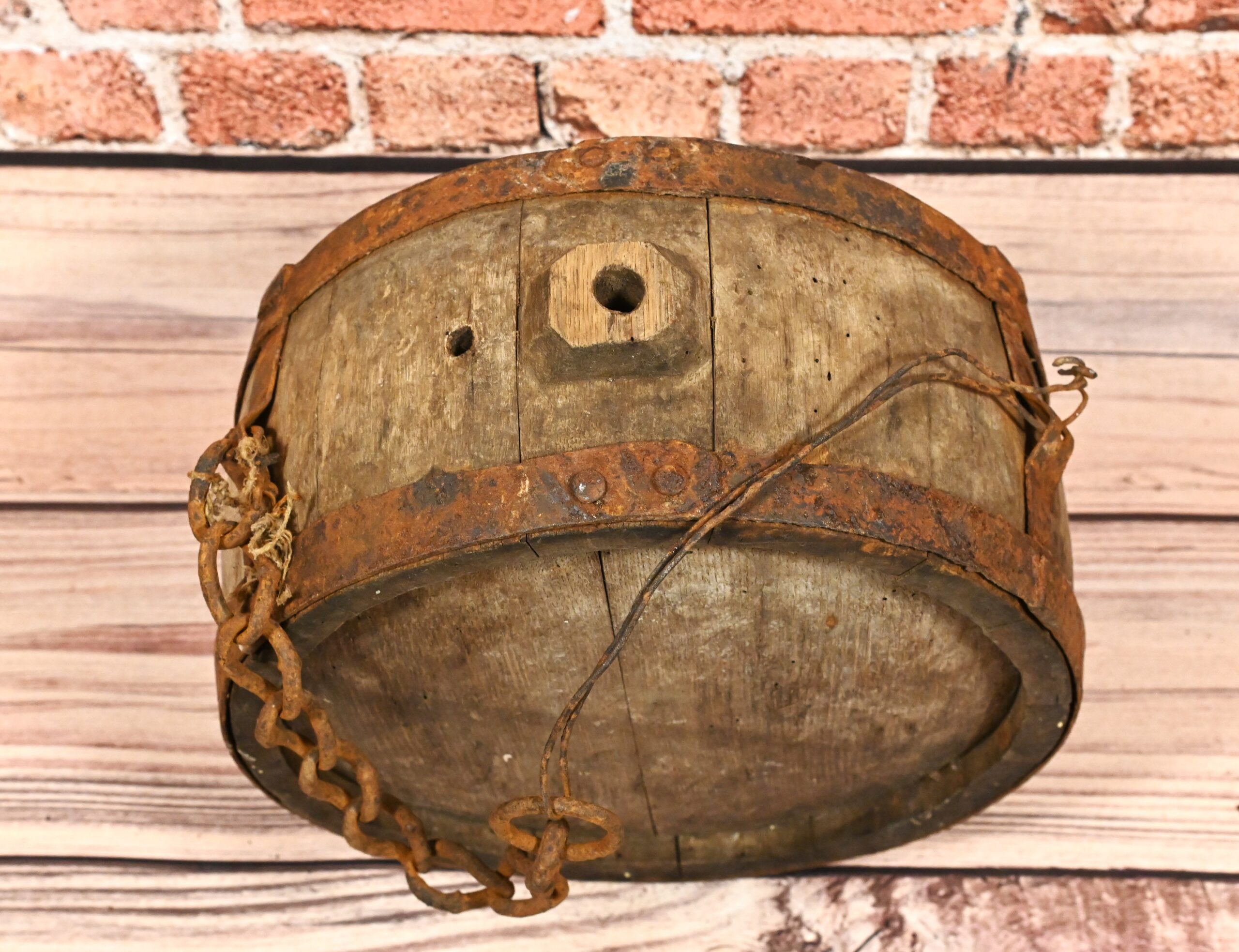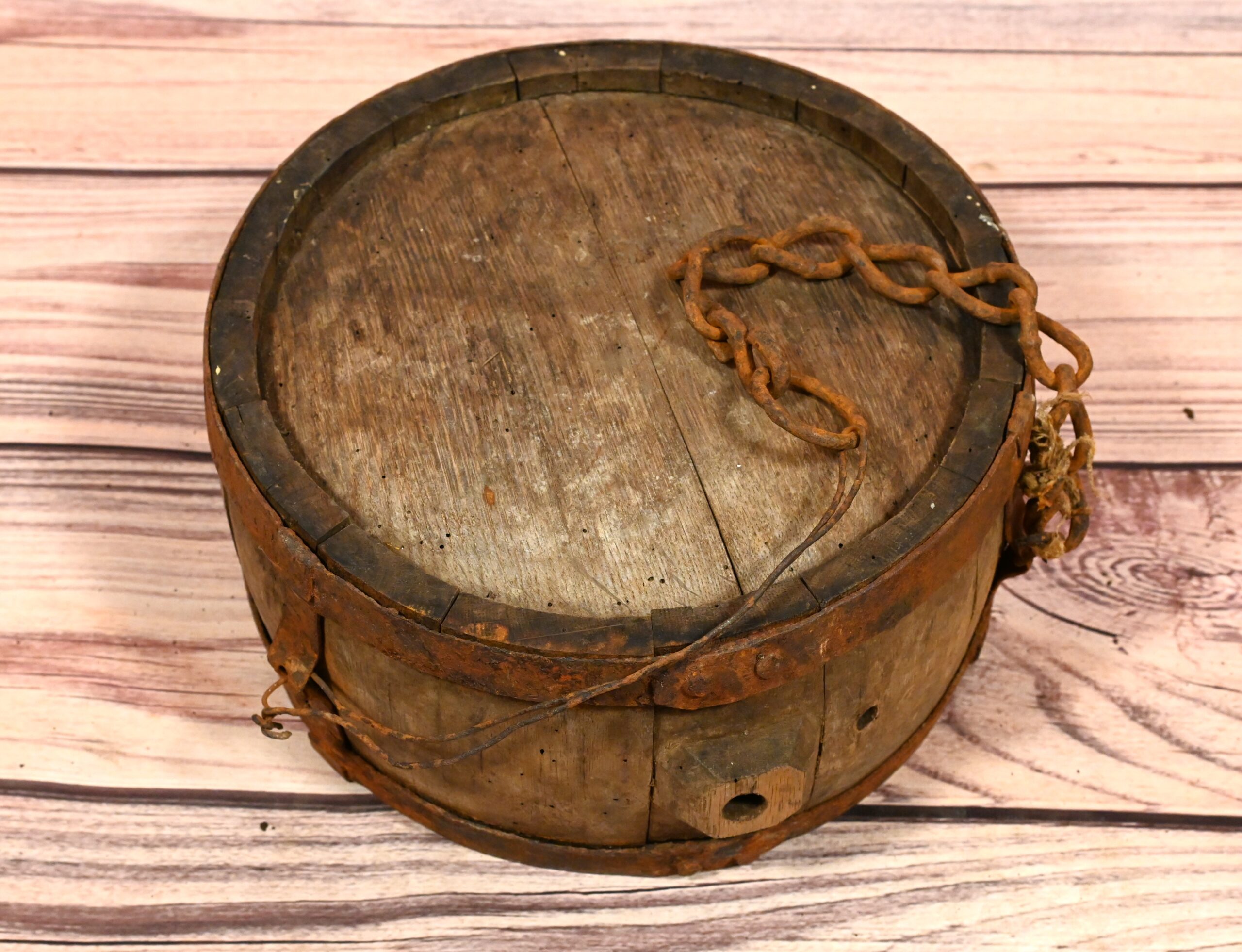Stary, drewniany pojemnik w stylu vintage. Nosi ślady użytkowania. Wymiary: średnica38cm; wysokość 16,5cm.