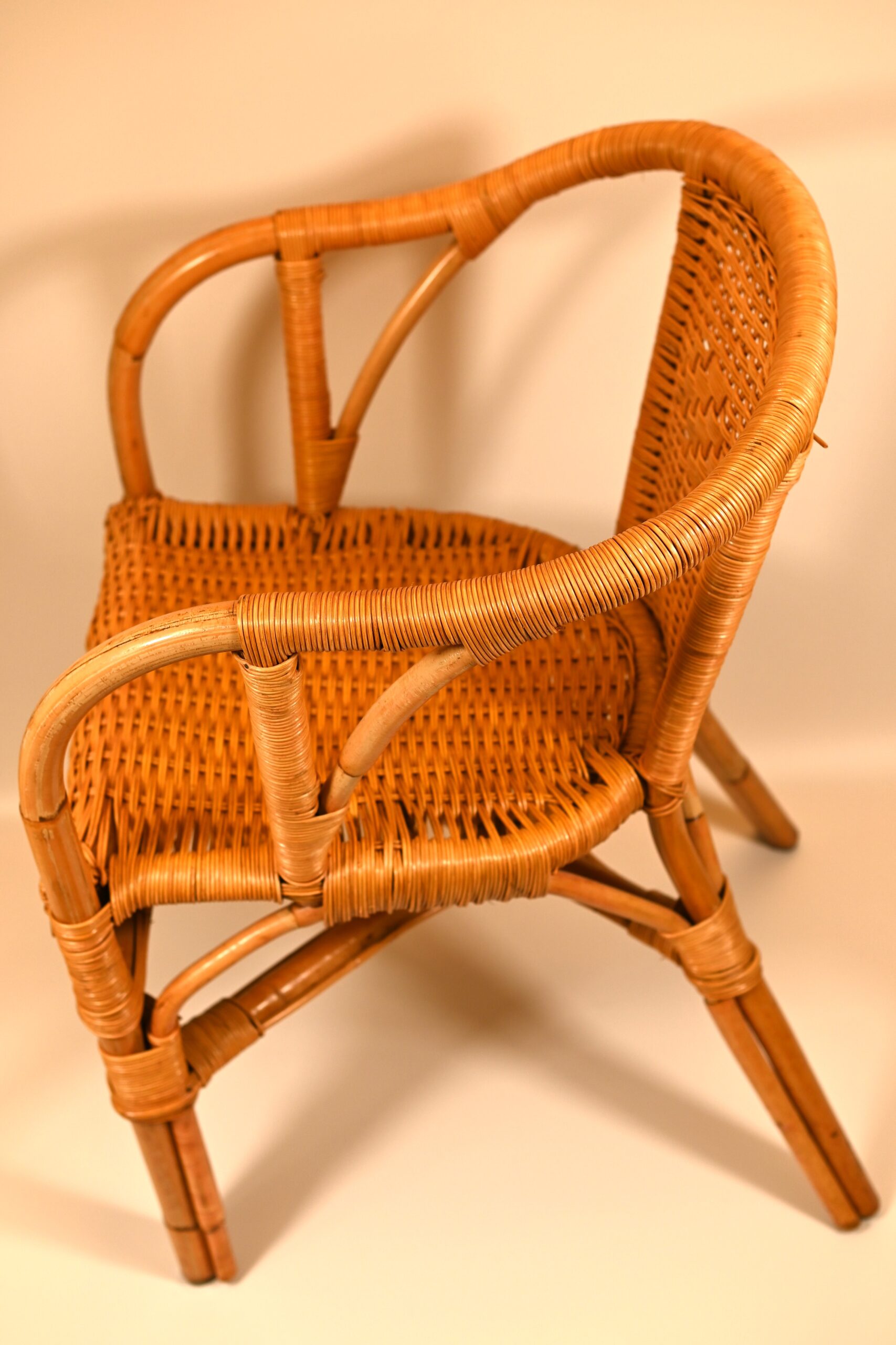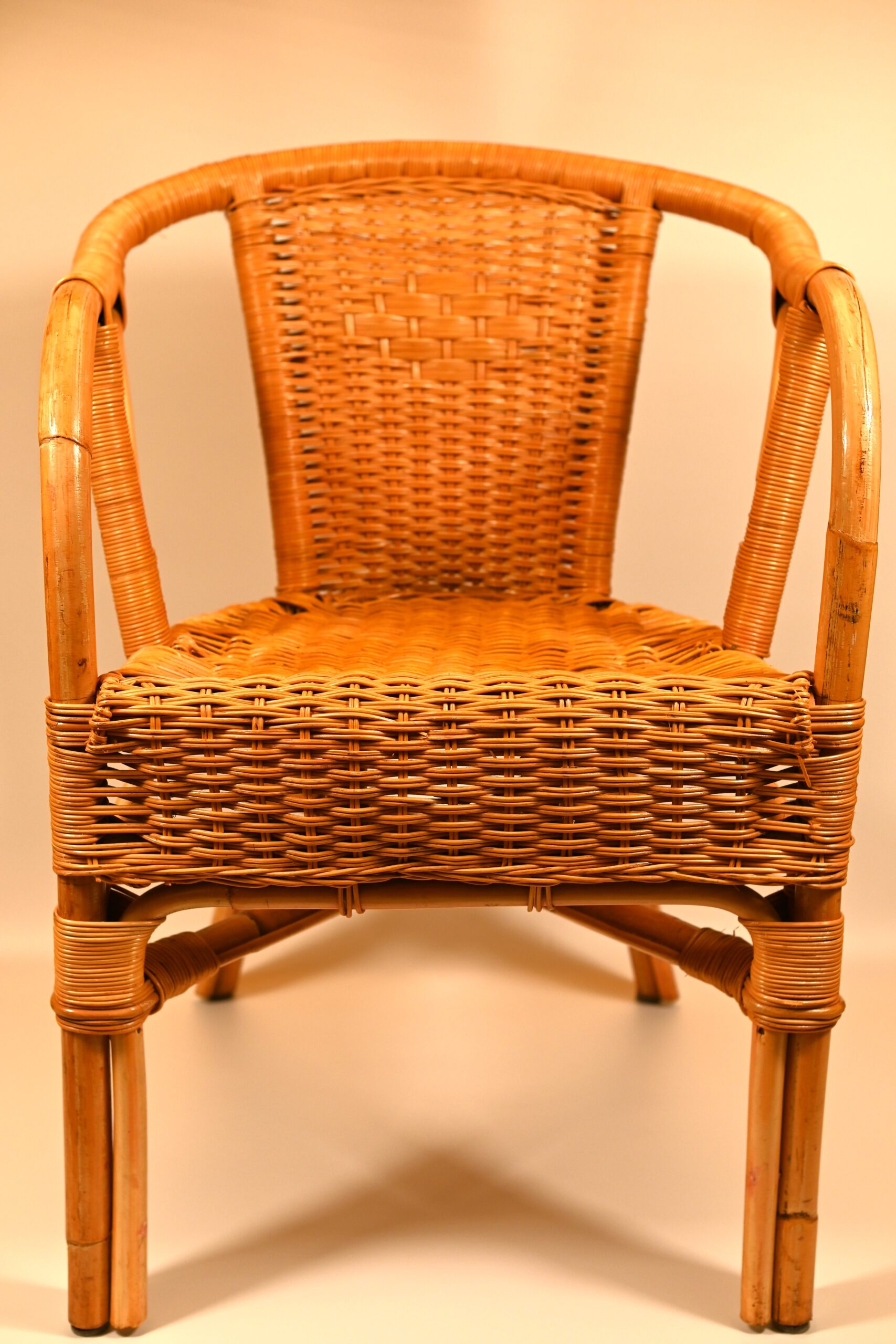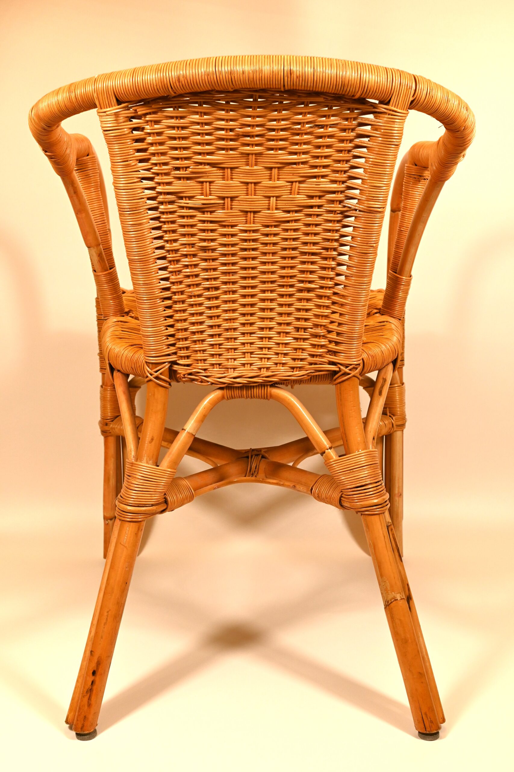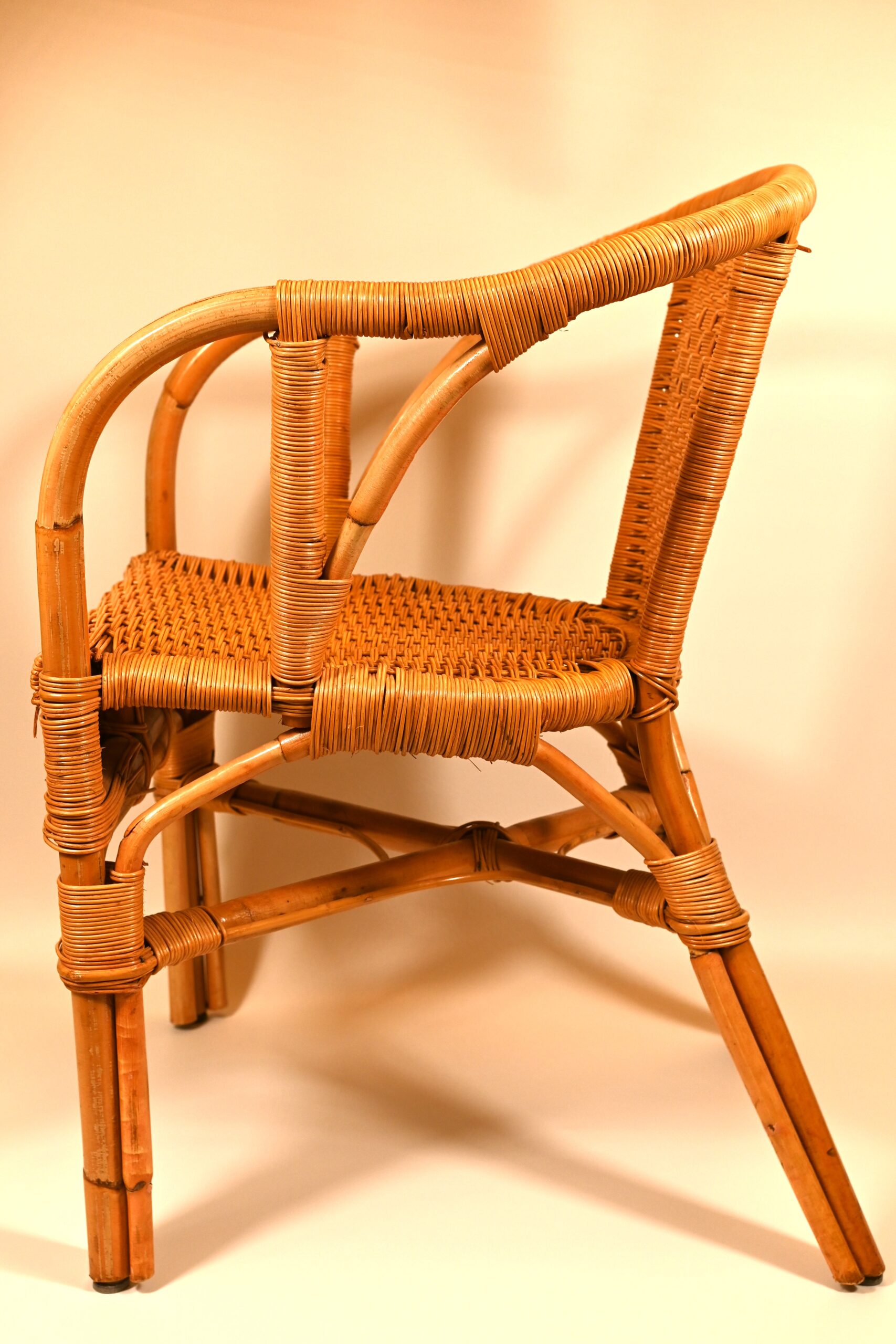 Bambusowy fotel. Kraj pochodzenia Holandia, oszacowany okres – II połowa 20w. Stan dobry, z niewielkimi śladami użytkowania. Wymiary: wysokość 80cm, szerokość 50cm, głębokość 57cm.