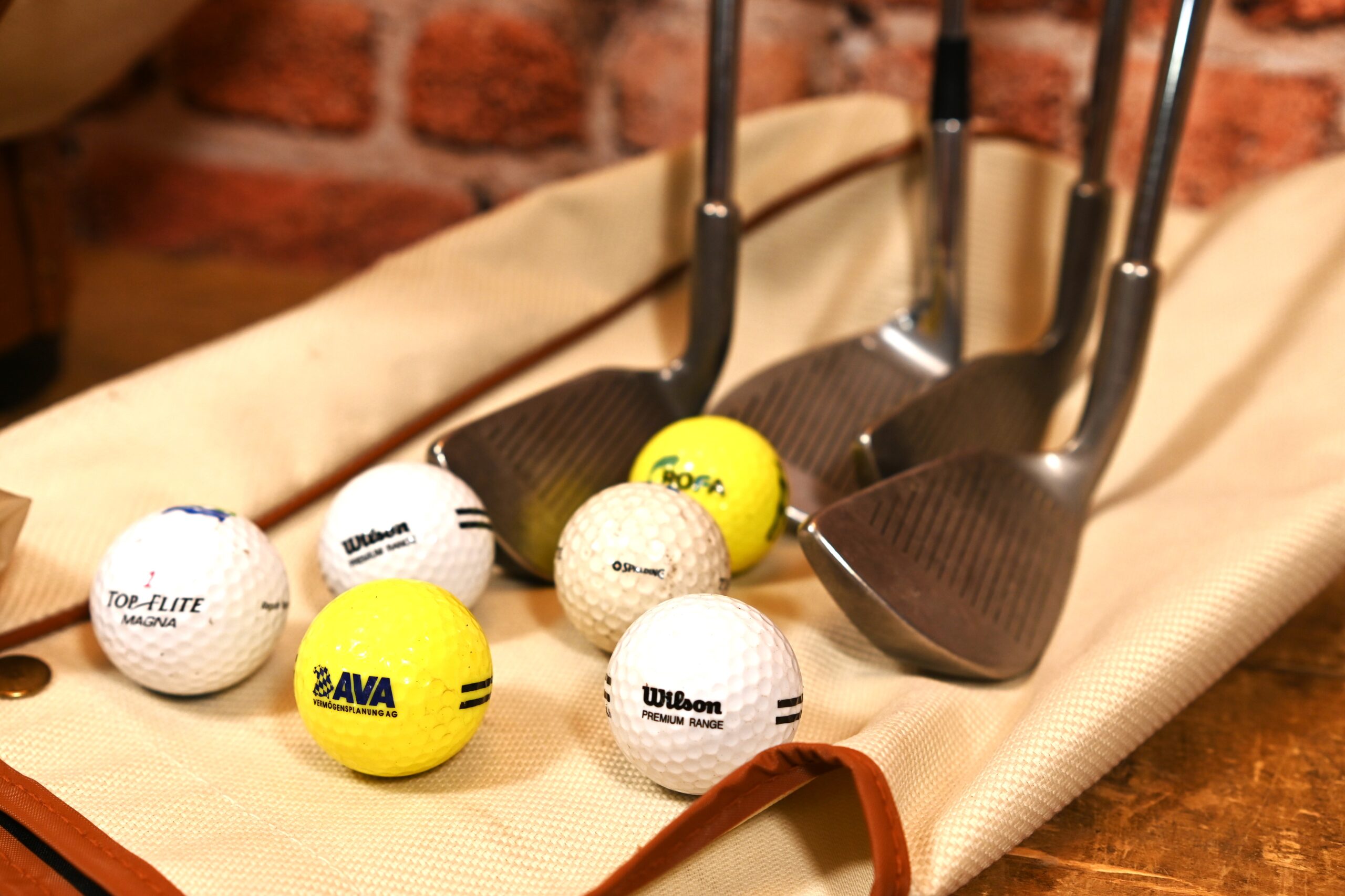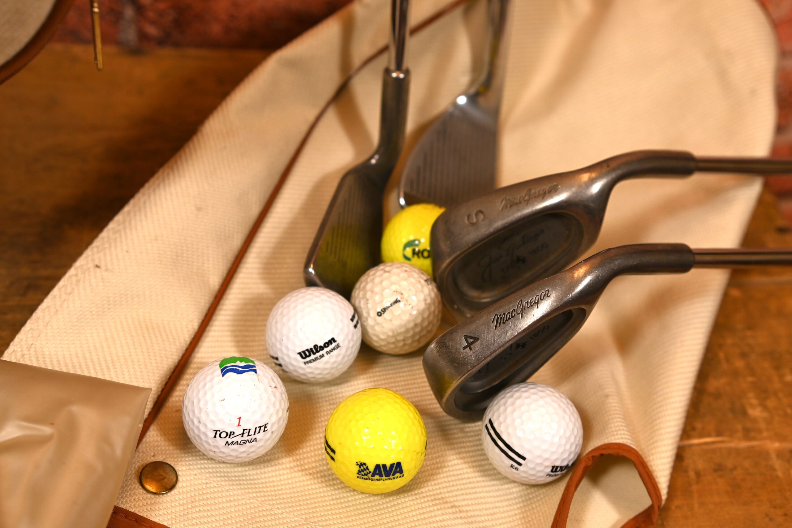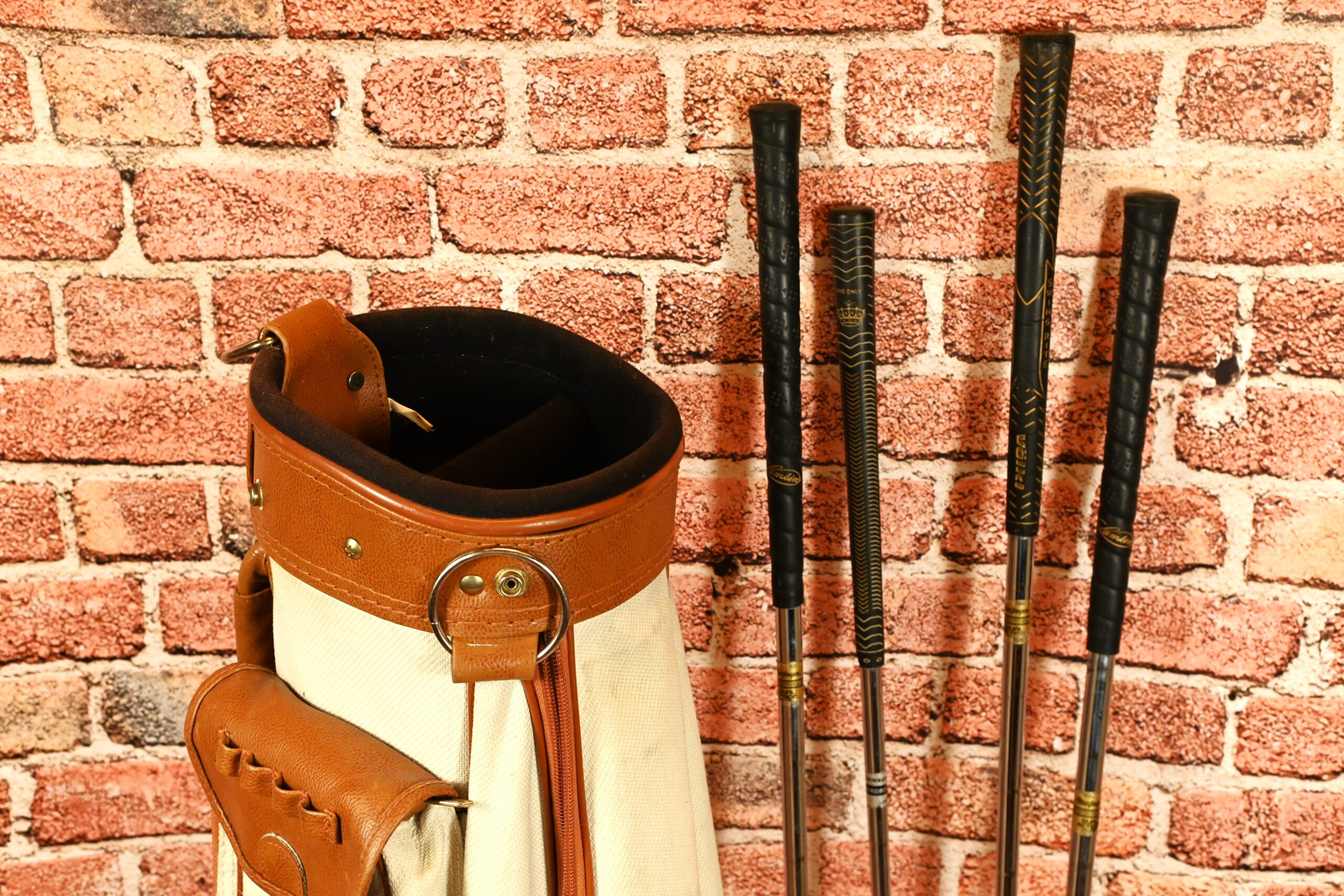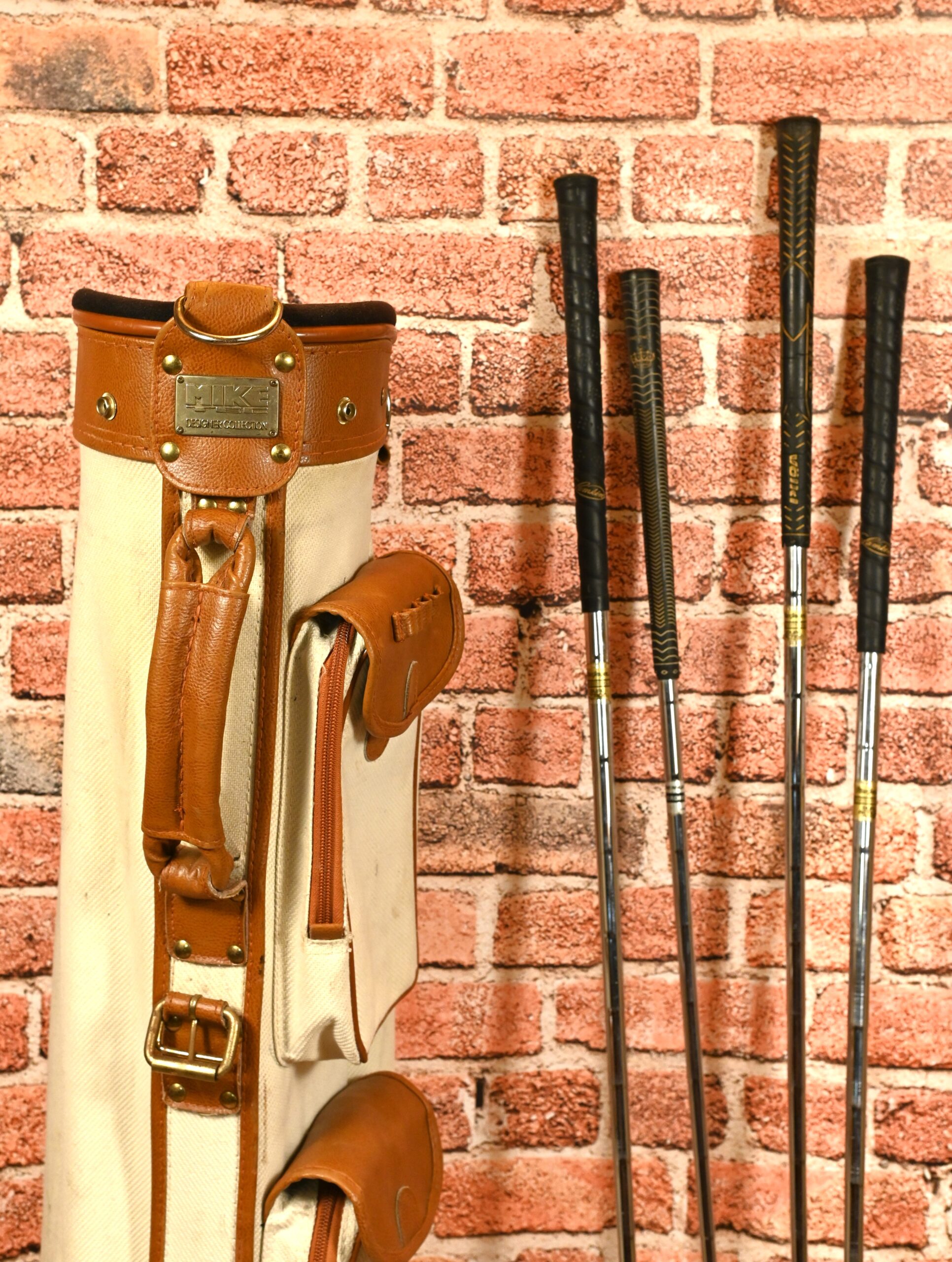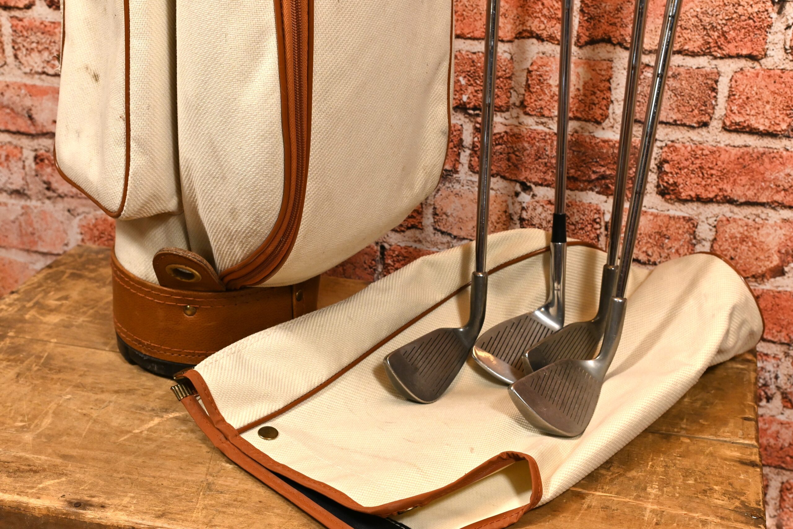 Zestaw do golfa – torba, pokrowiec od deszczu, piłeczki, cztery kije, nosi ślady użytkowania. Kraj pochodzenia Anglia. Może być dekoracją wnętrza. Wymiary torby: wysokość 88cm; szerokość 20cm; głębokość 27cm.