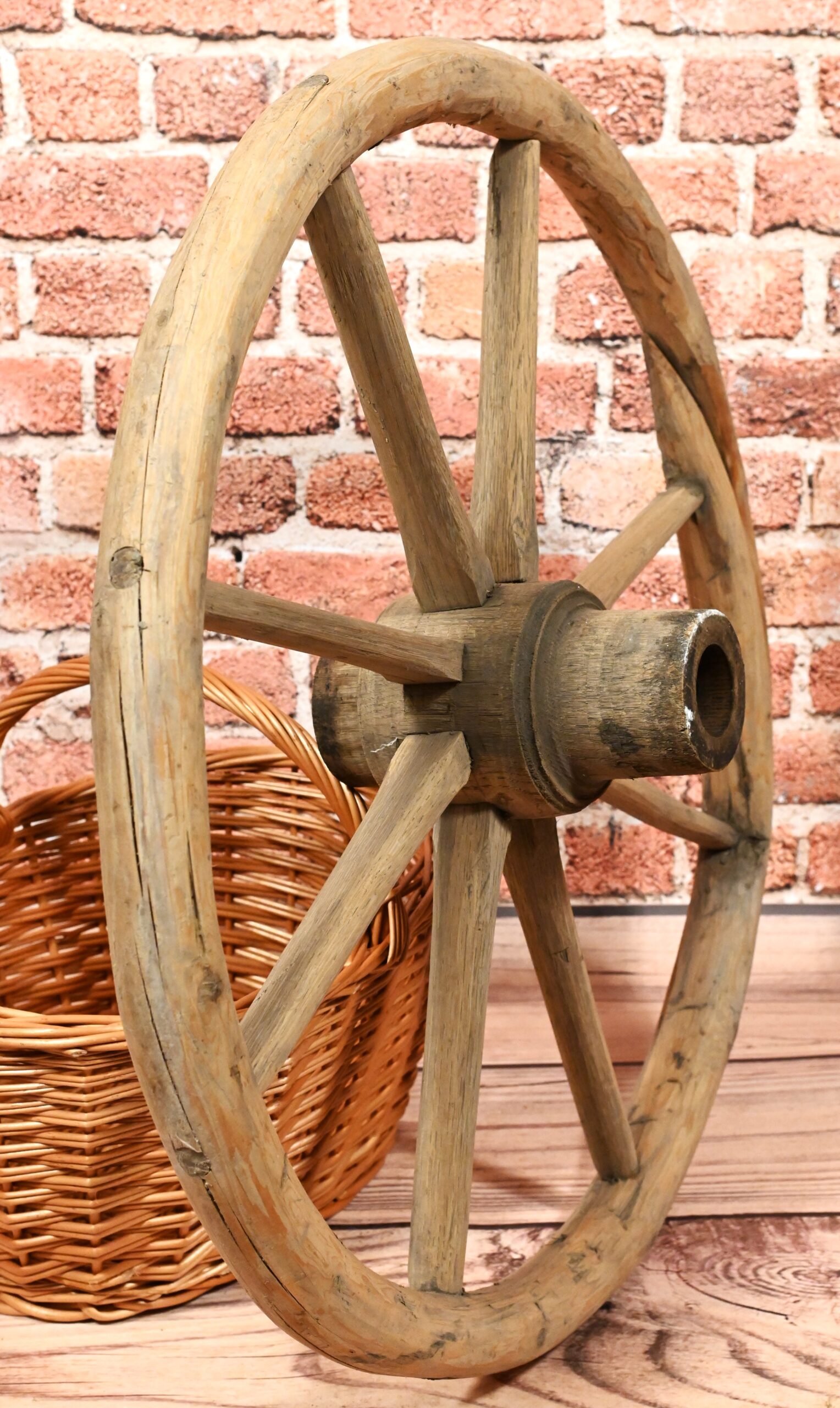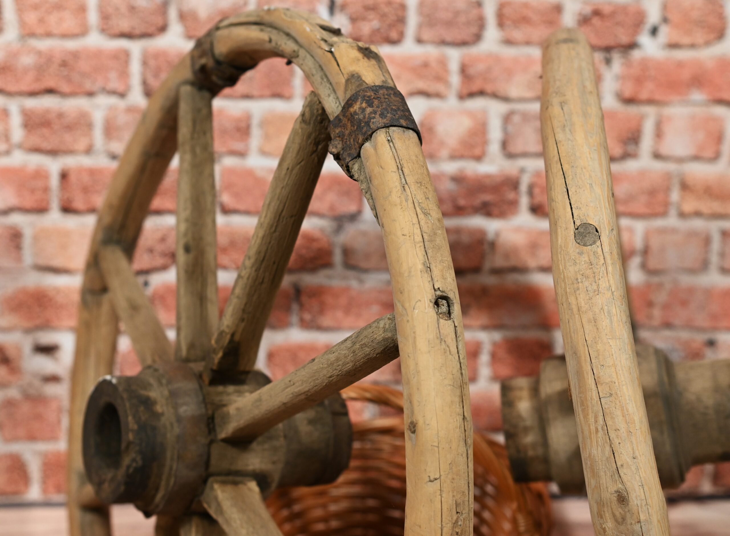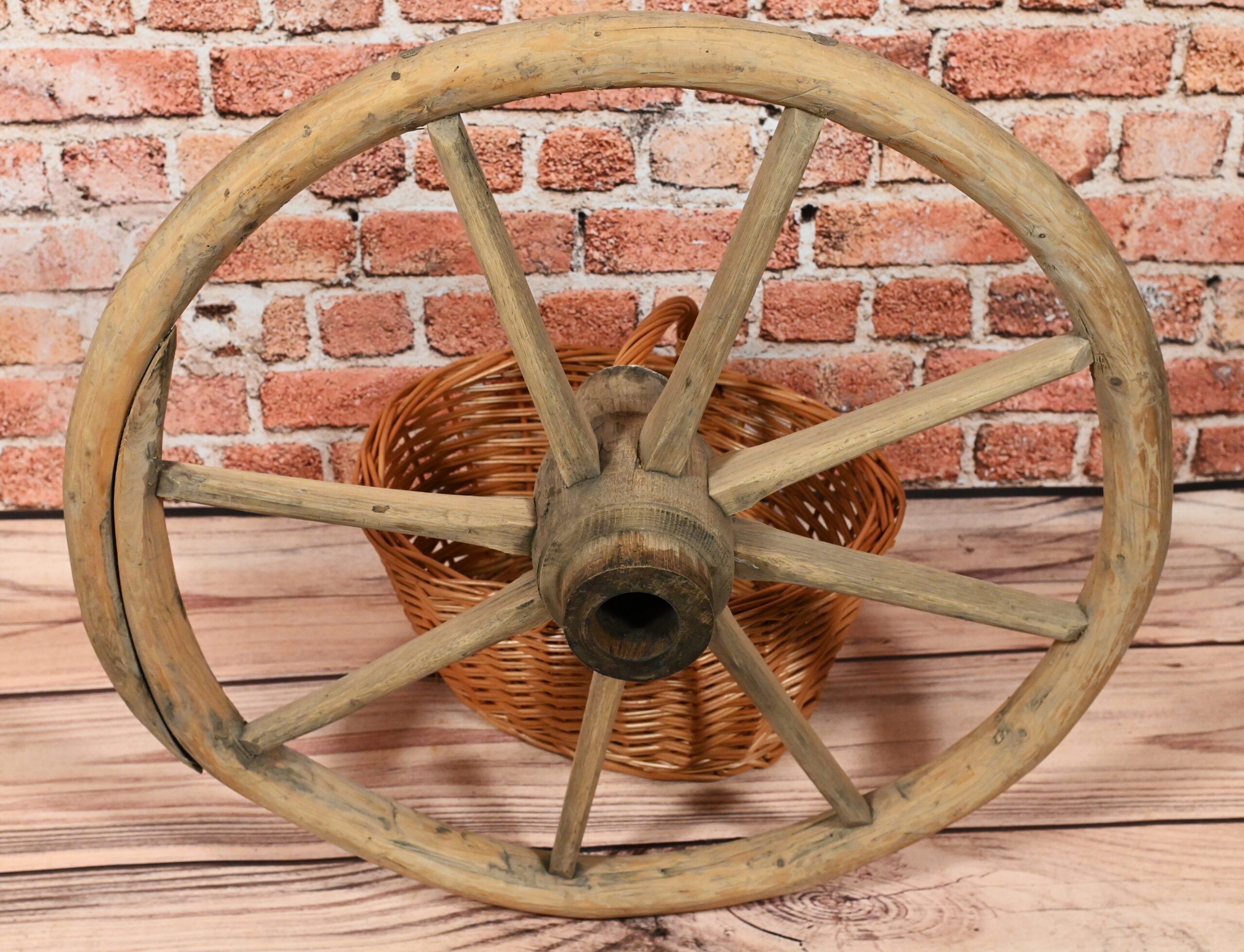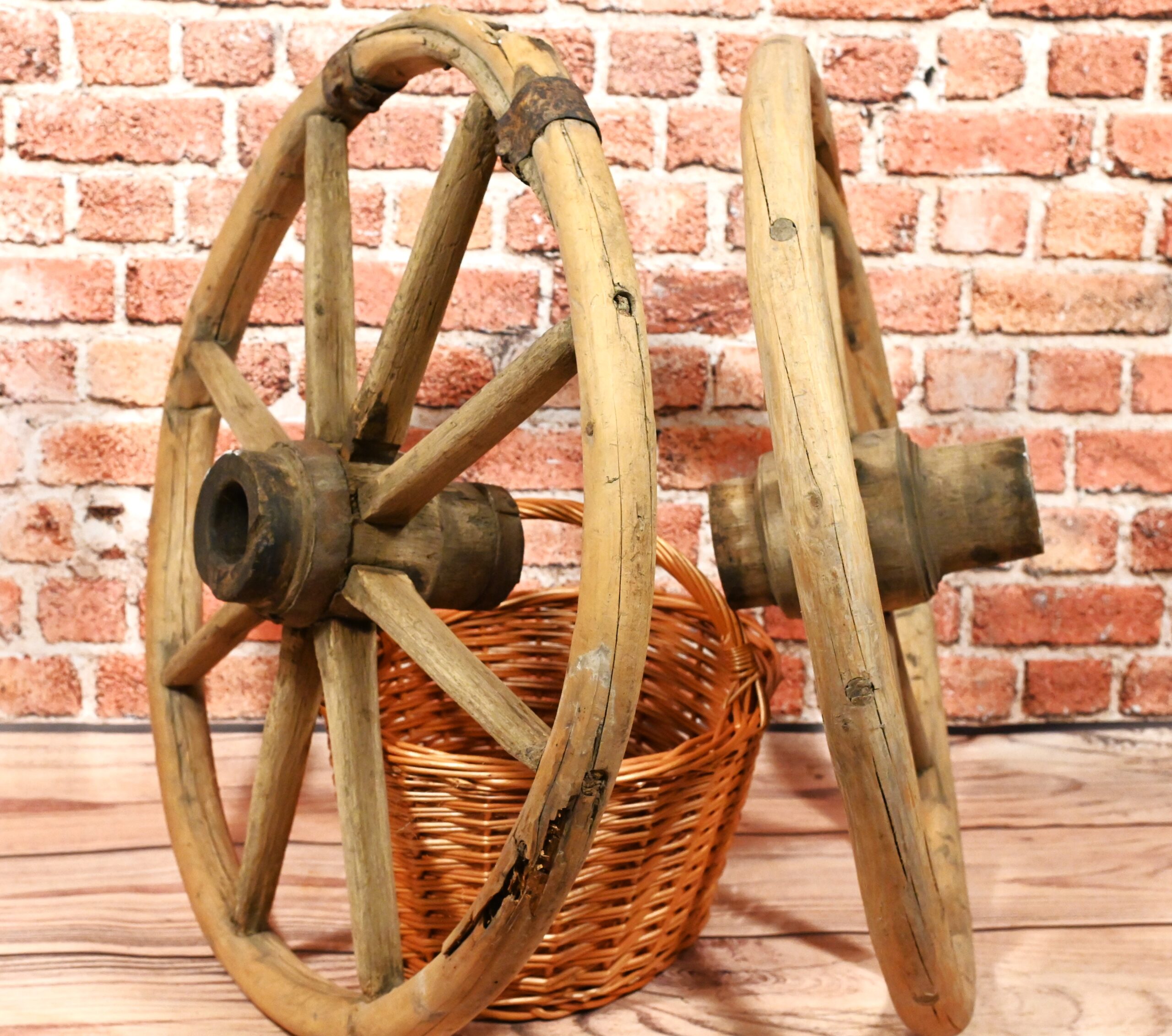 Stare gięte koła od wozu. Mogą stanowić doskonały element dekoracyjny. Wymiary: średnica 62cm; grubość kół 4cm.