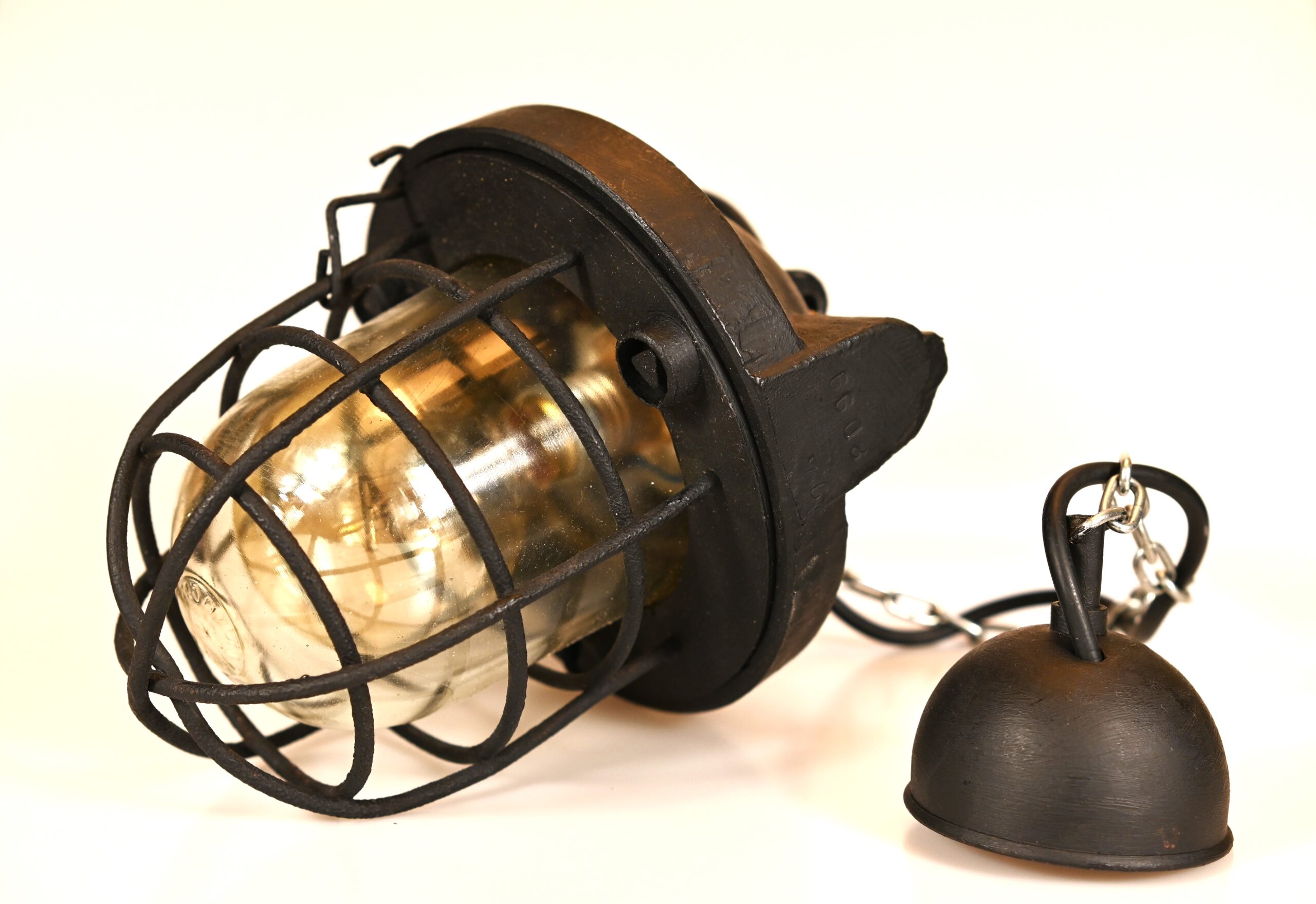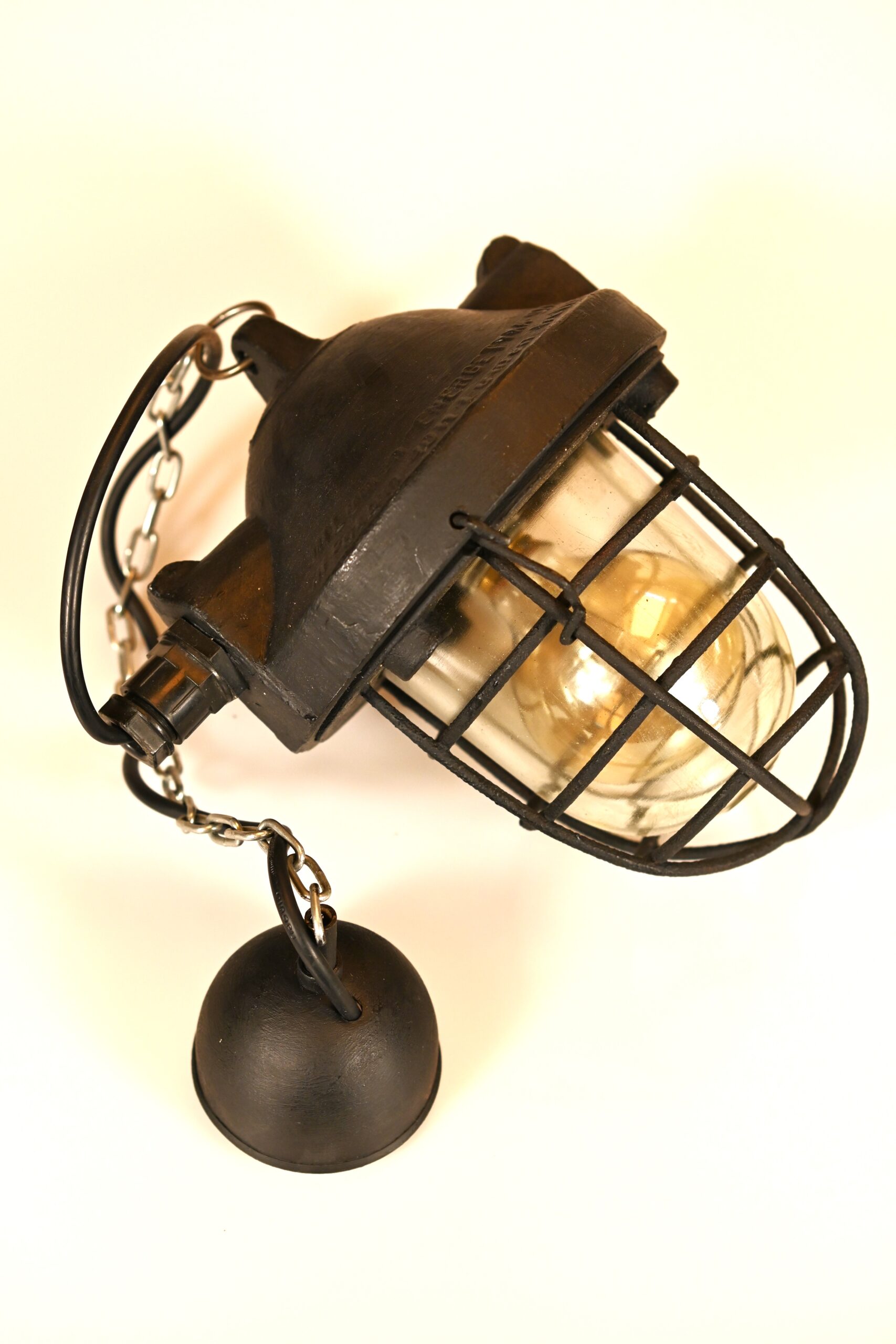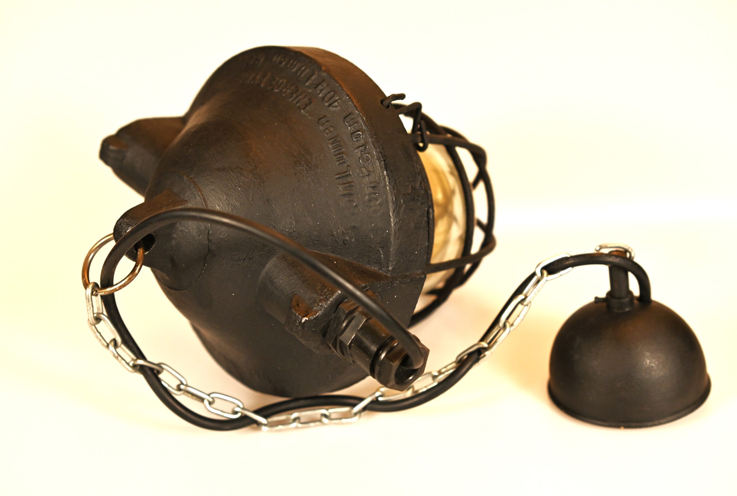 Loftowa wisząca lampa, kolor czarny. Stan bardzo dobry. Odnowiona. Wymiary: wysokość 25cm, szerokość 18cm.