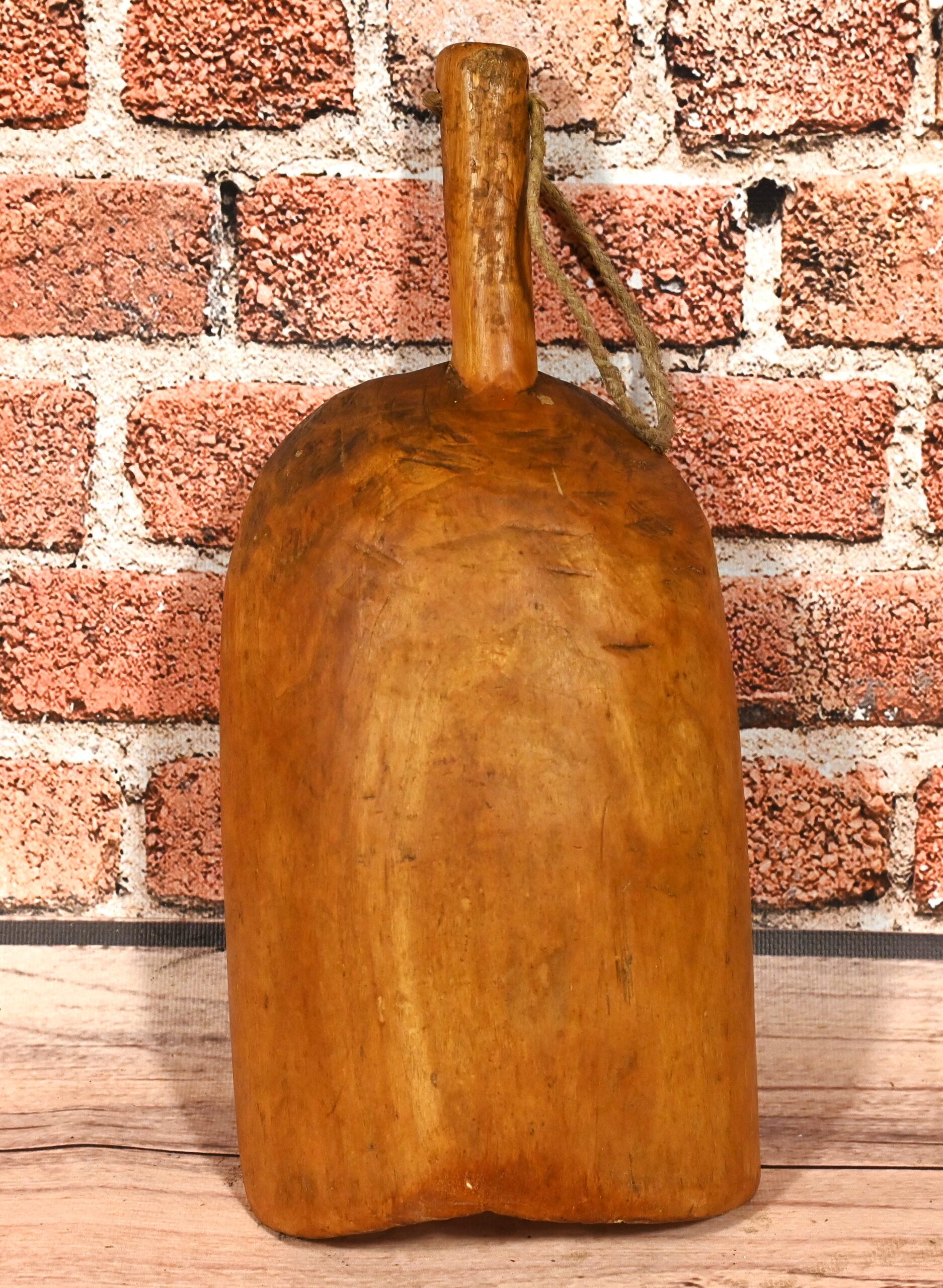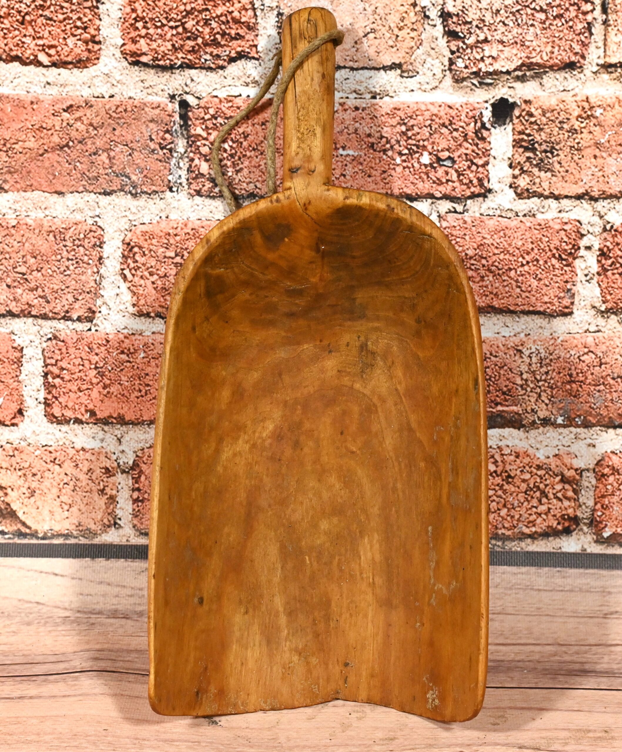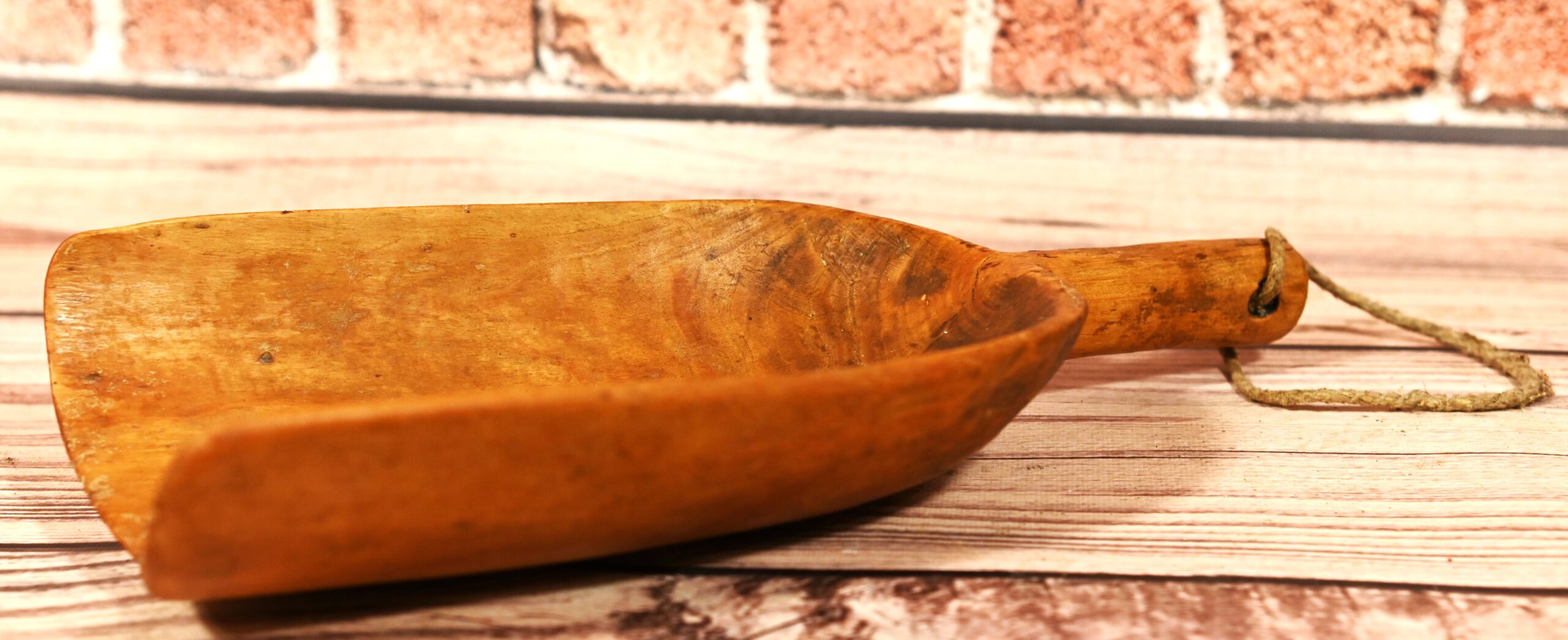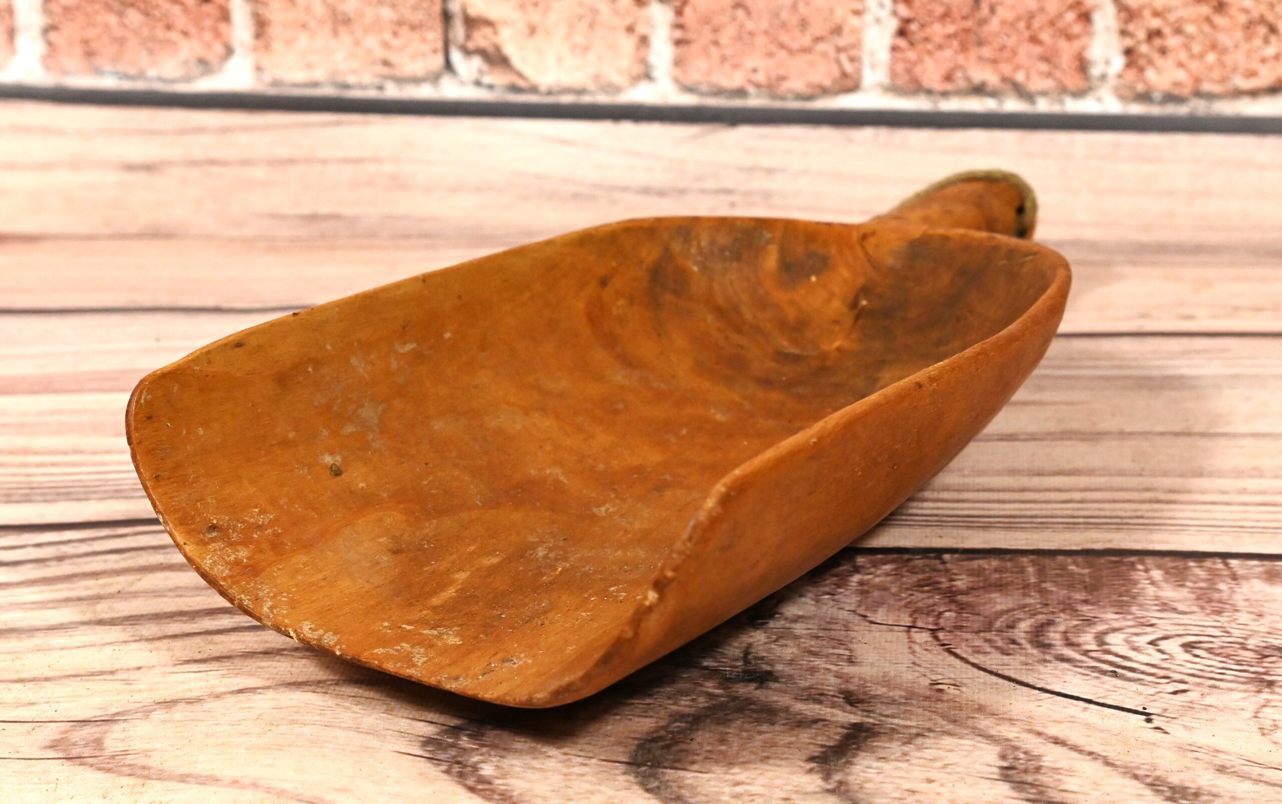 Stara, drewniana łopatka do mąki. Nosi ślady użytkowania. Wymiary: długość 35 cm; szerokość 16 cm; głębokość 8,5 cm.