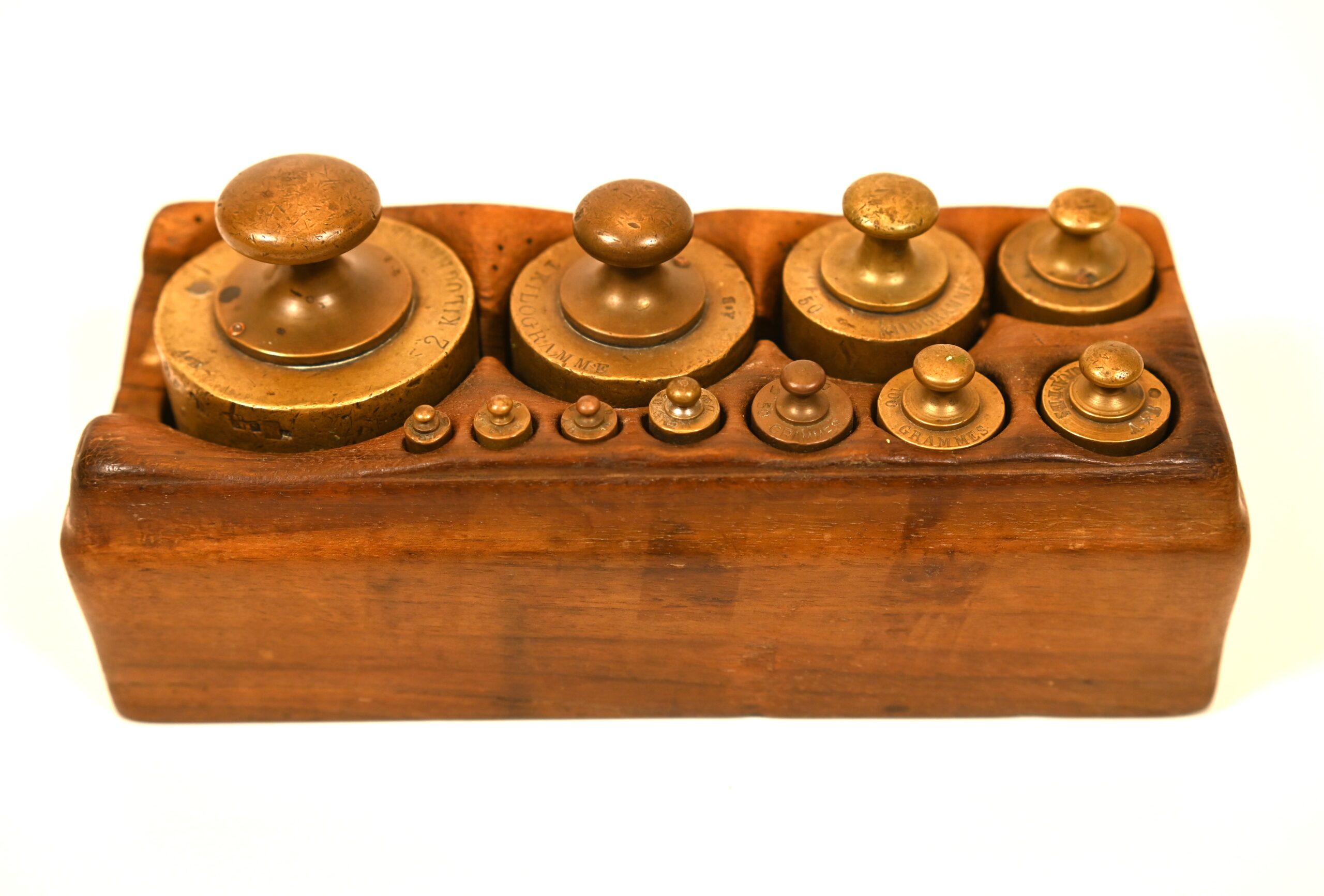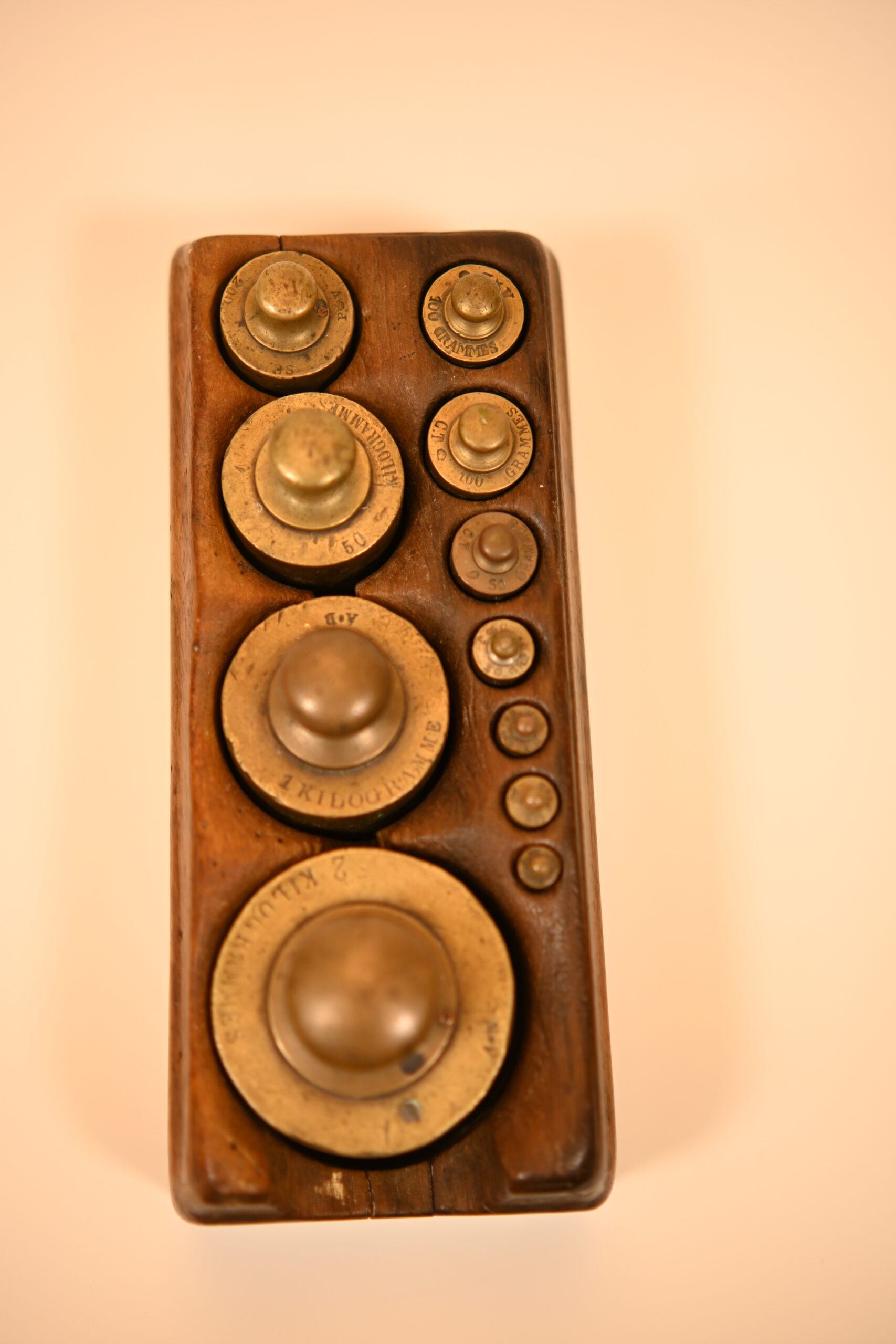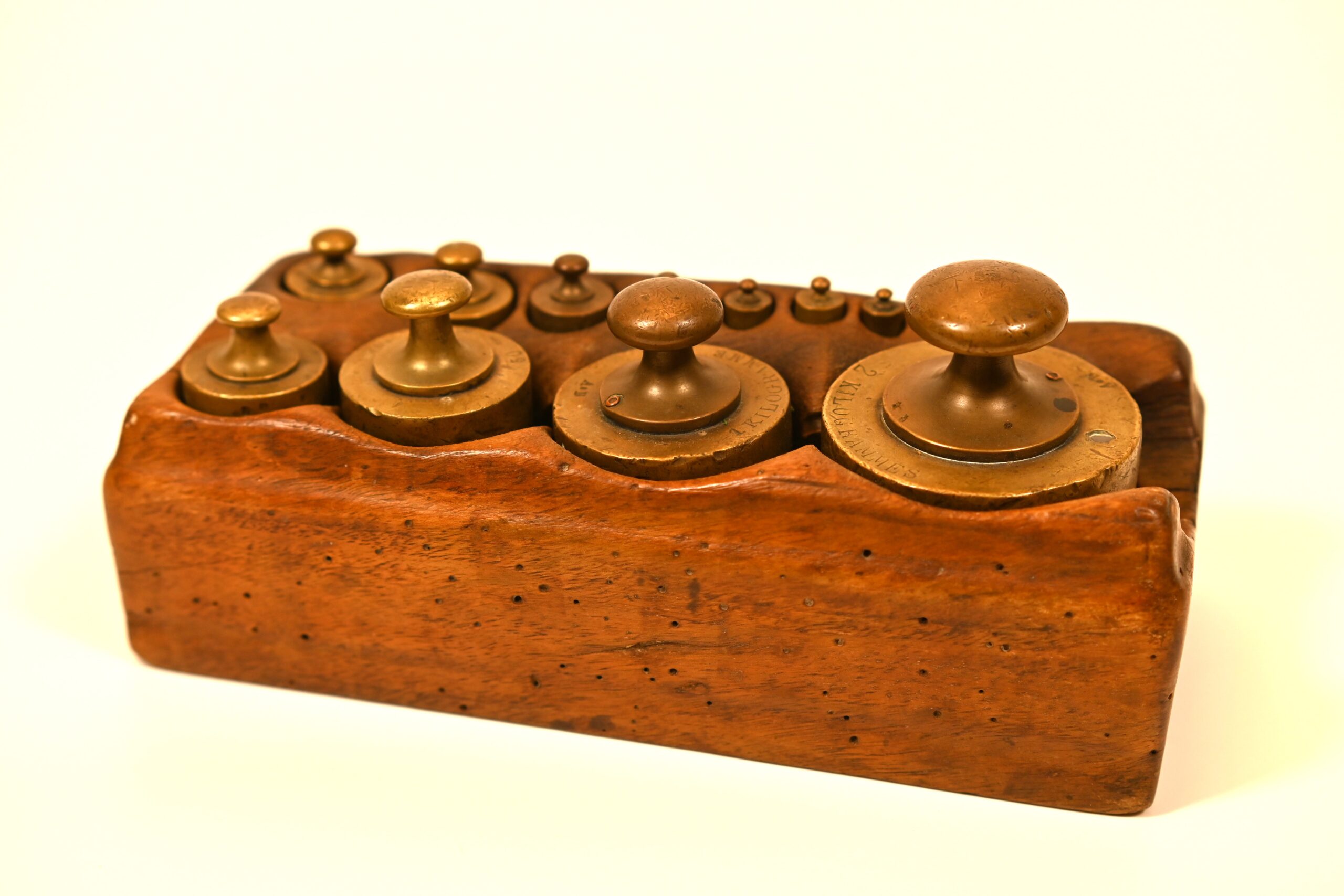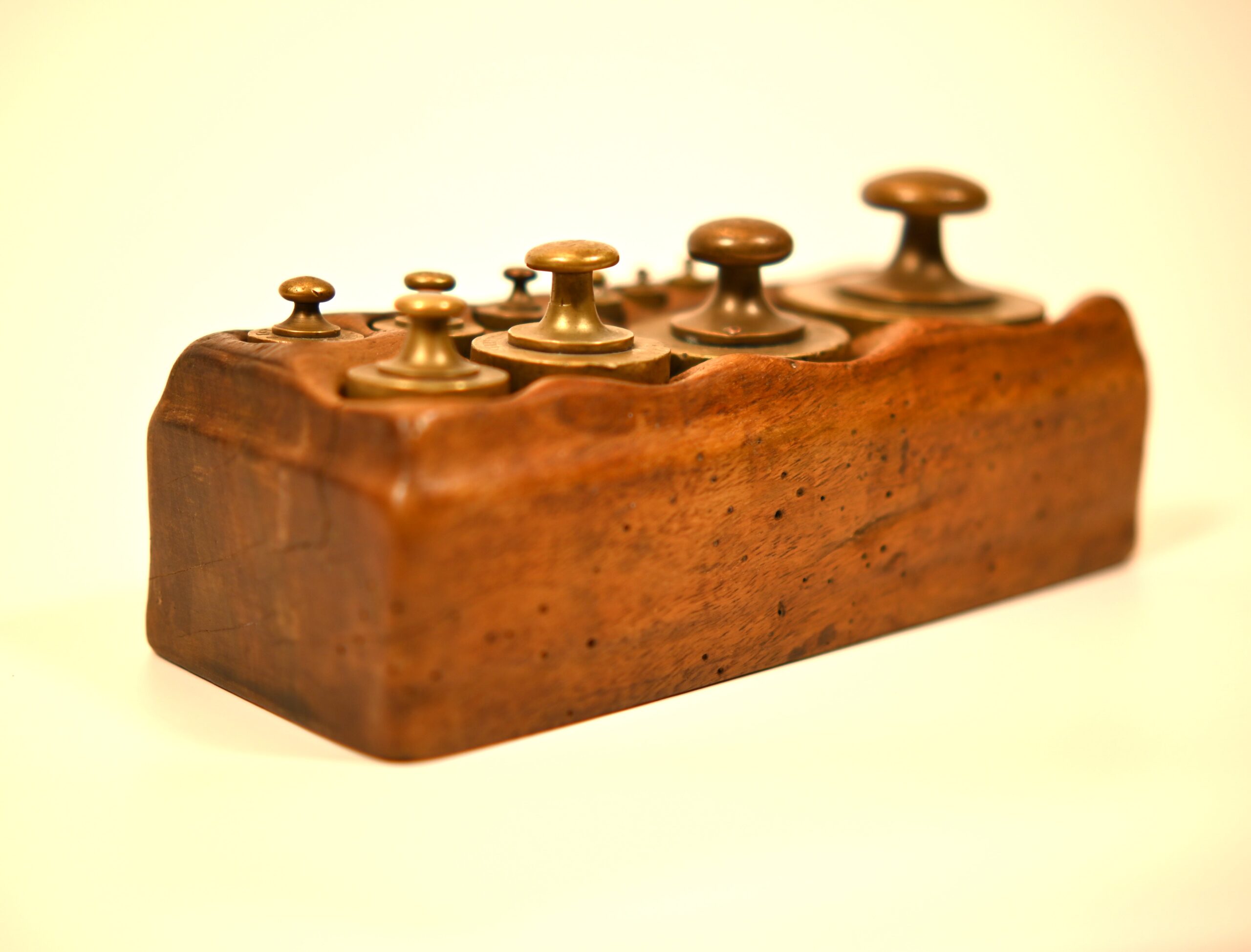 Piękny, francuski zestaw odważników mosiężno – miedzianych w ozdobnym drewnianym bloku. Dawniej używany we francuskim sklepie mięsnym. Szacowany okres pochodzenia to początek XX wieku. Kraj pochodzenia – Francja. Wymiary 10cm x 23cm x 10cm