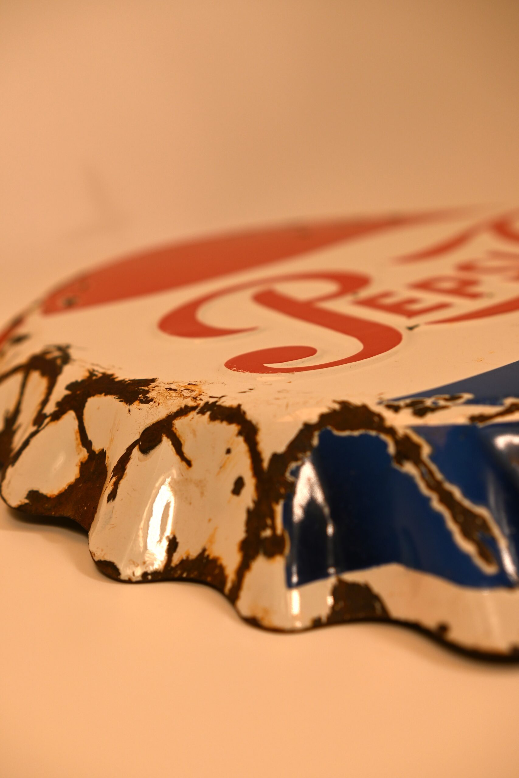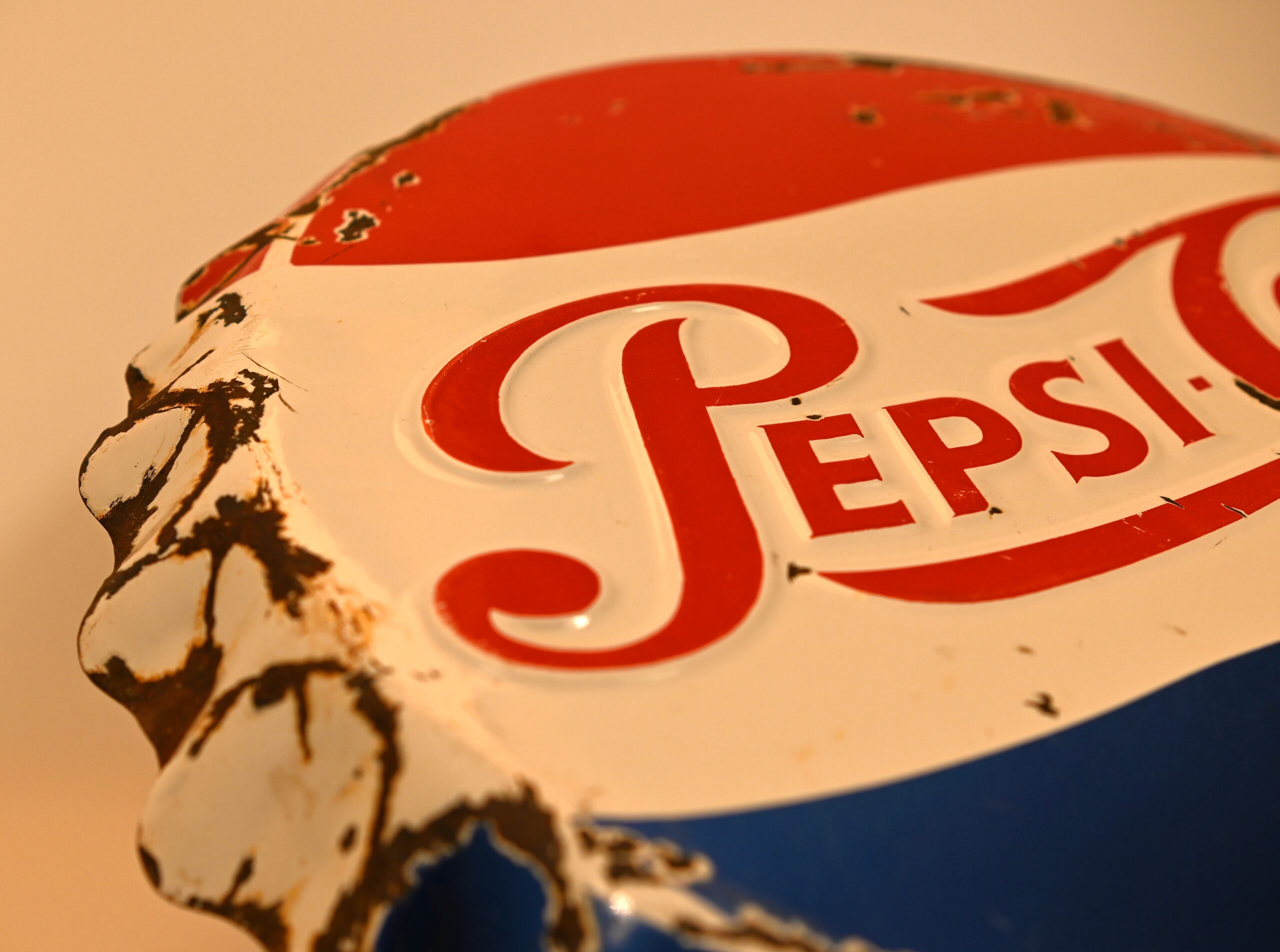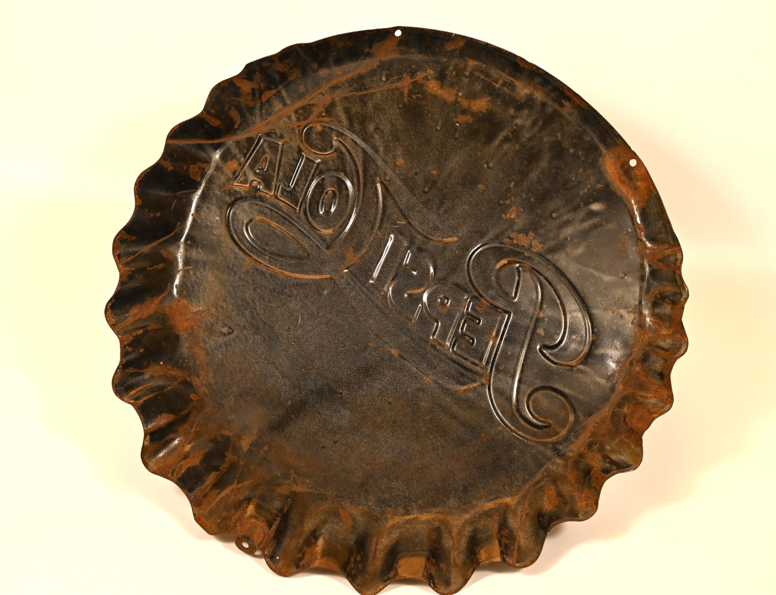Oryginalna hiszpańska reklama Pepsi w postaci kapsla o średnicy 49cm. Rok produkcji 1950 – 1959. Stan dobry, jak widać na zdjęciach. Drobne otarcia, przerysowania.