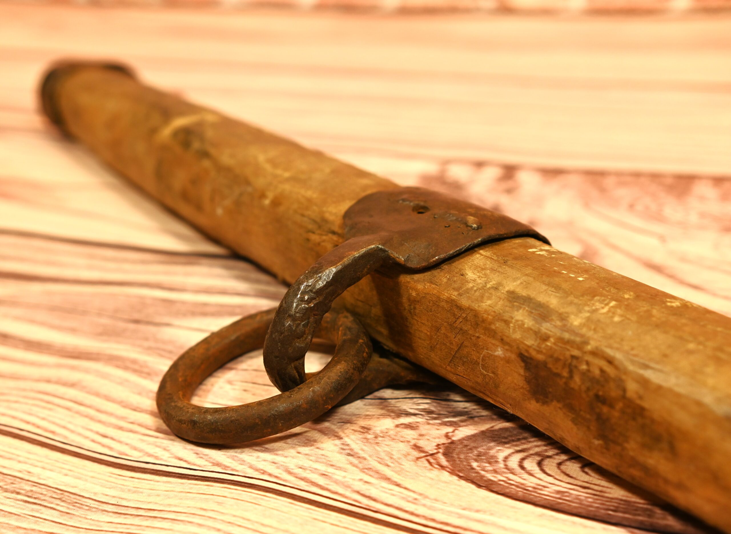 Stary orczyk do zaprzęgu. Wymiary: długość – 87cm, średnica – 7cm; wysokość okucia dużego – 12cm, wysokość małych okuć – 7,5 cm. Może być wykorzystany jako element dekoracyjny lub jako część żyrandola.