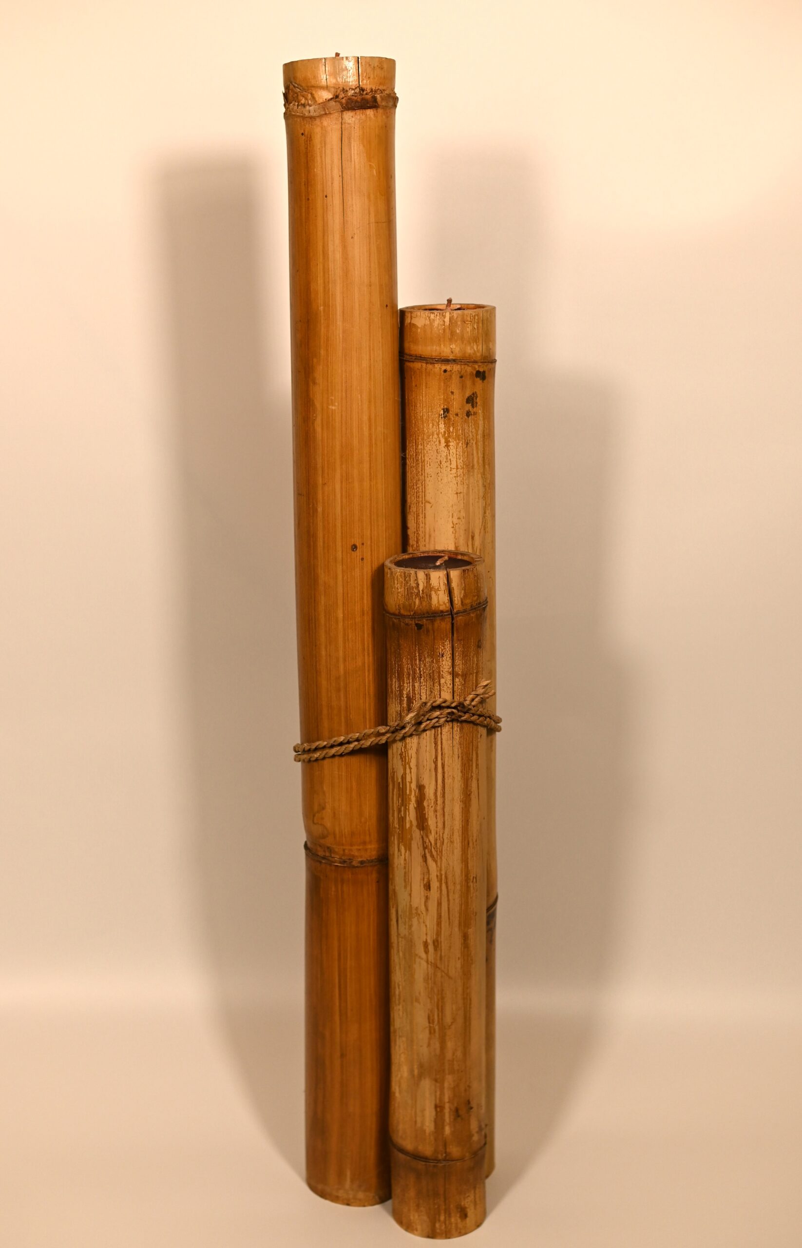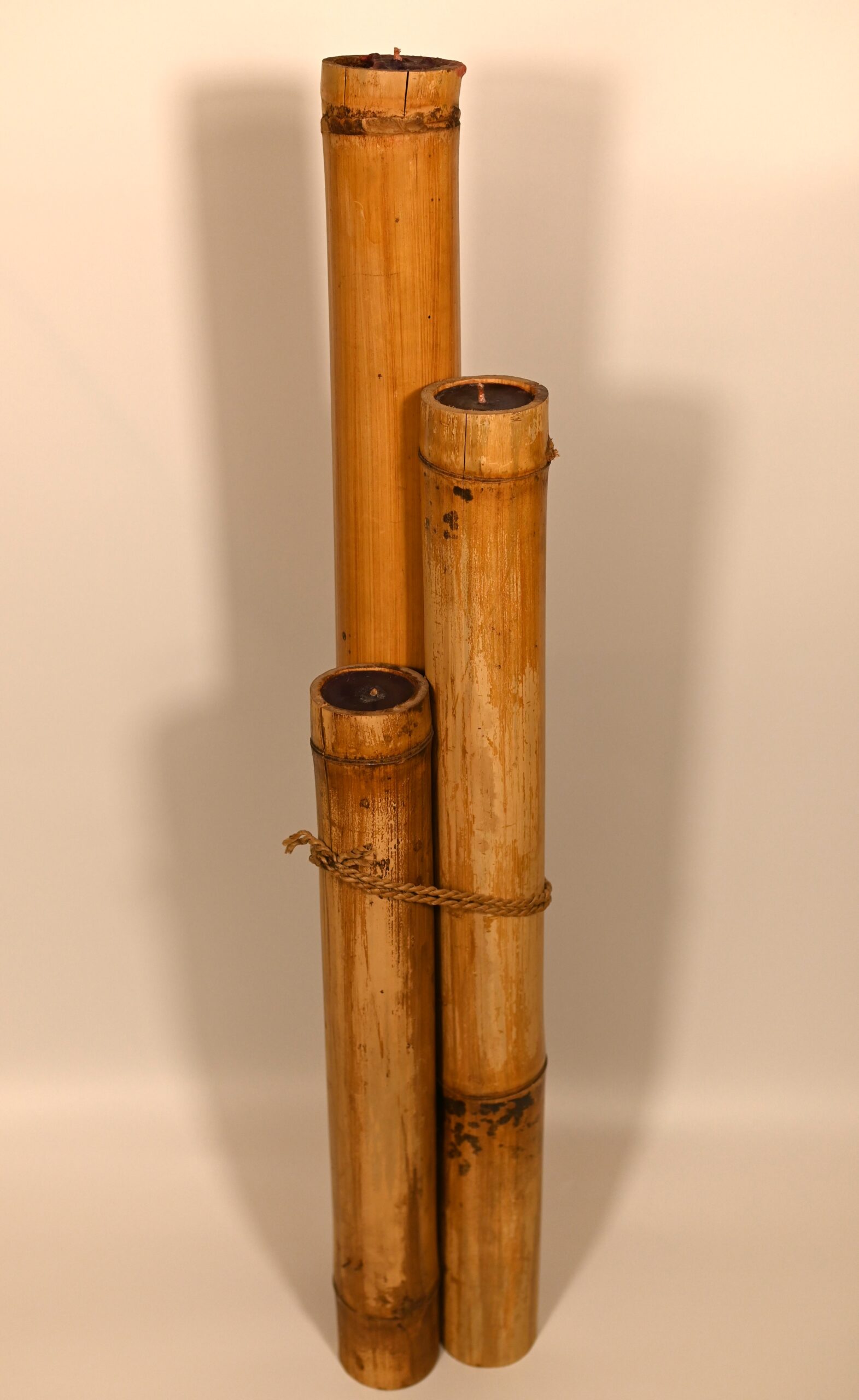 Świecznik bambusowy składający się z trzech części połączonych ze sobą. Wysokość ich to najwyższa 100cm, średnia80cm i najniższa 60cm.