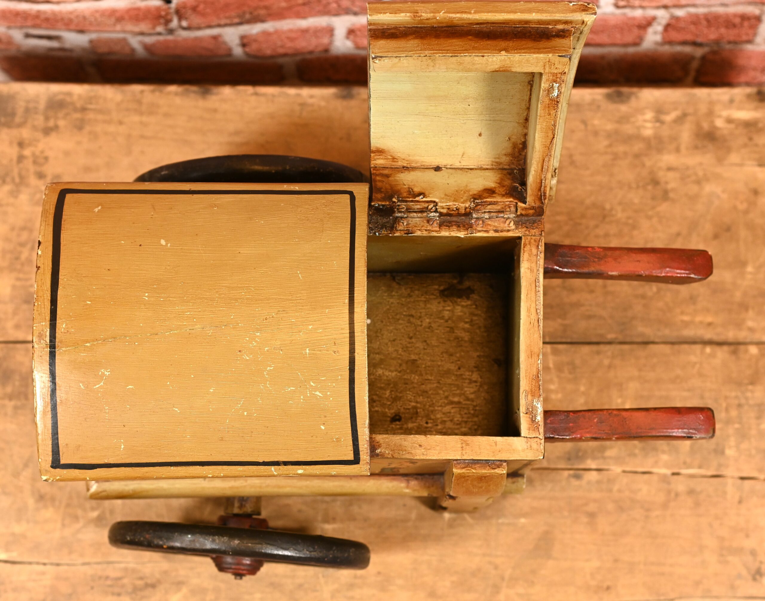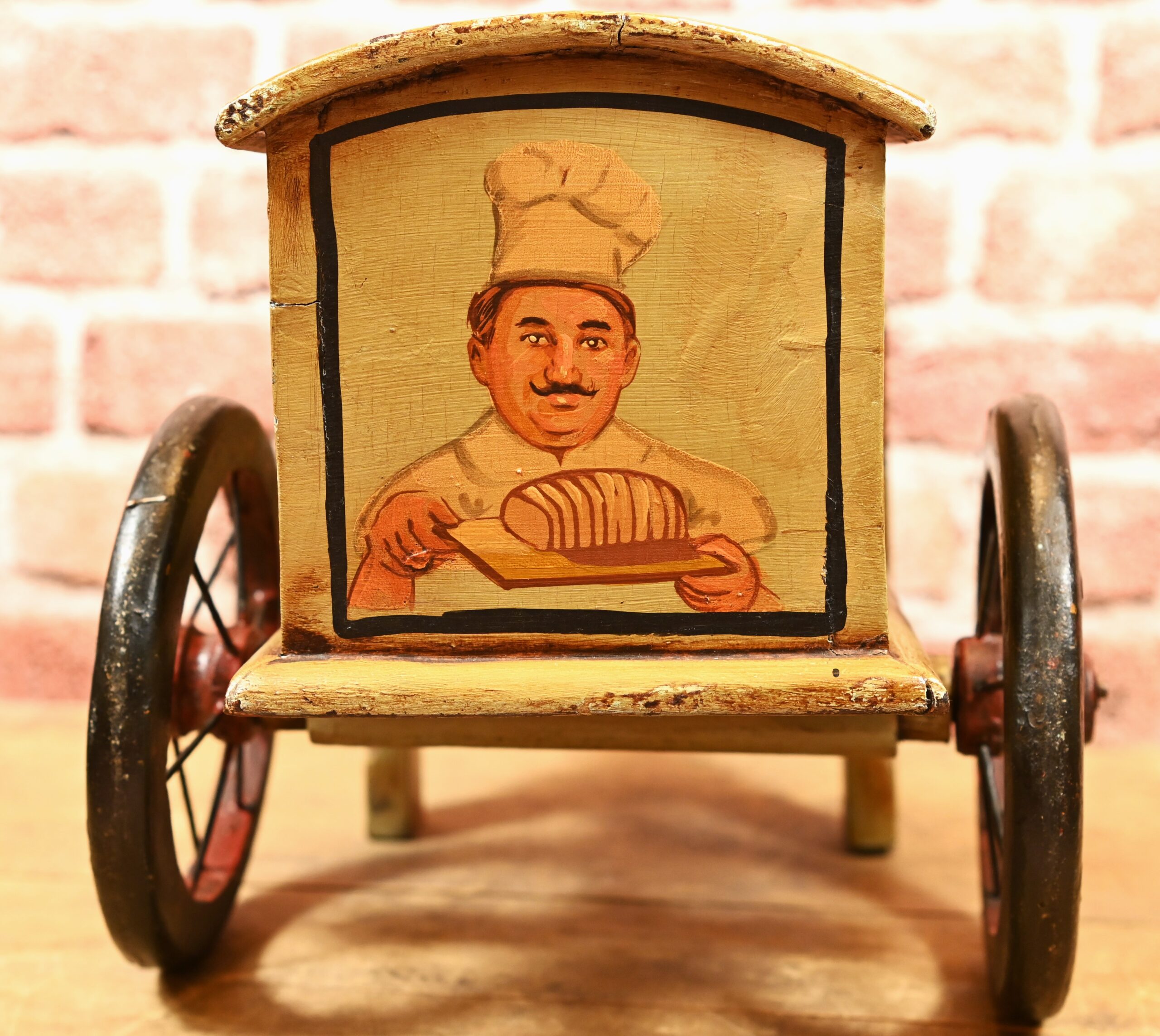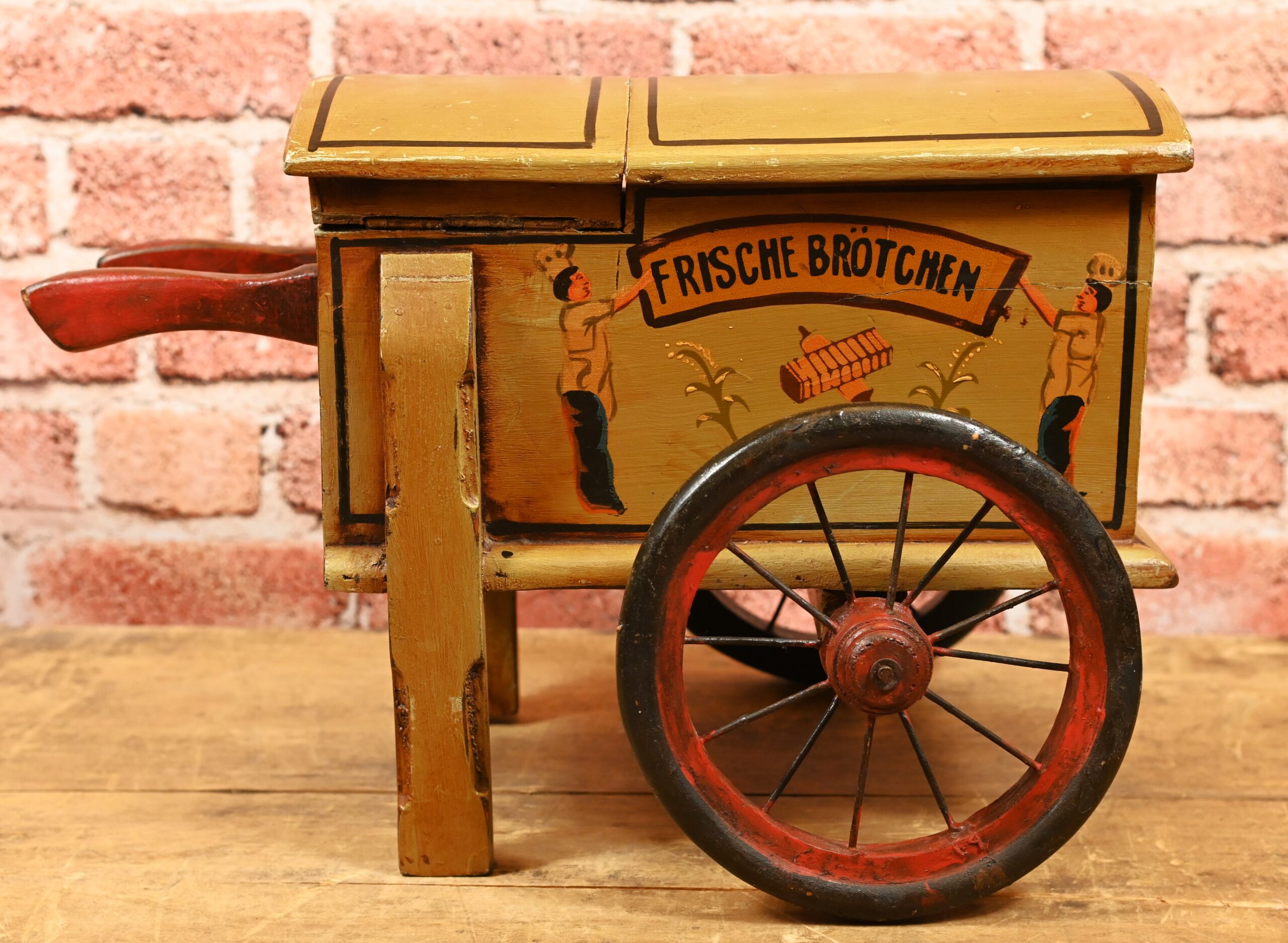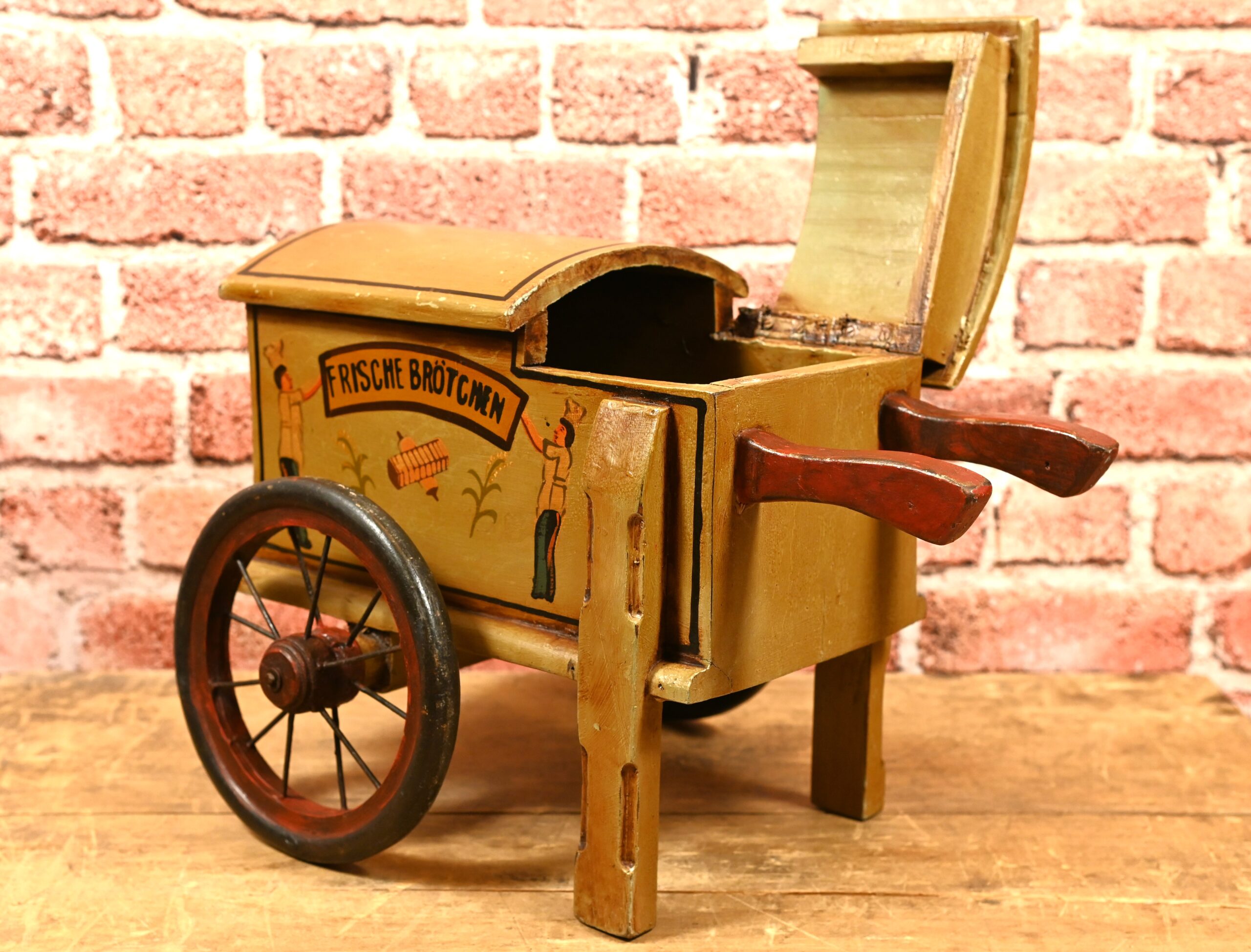Dekoracyjny, ręcznie robiony wózek piekarniczy, jeżdżący, ręcznie malowany z otwierana pokrywą. Kraj pochodzenia Niemcy, rok produkcji 1960-1970. Stan dobry, noszący ślady użytkowania. Wymiary: długość 39cm; wysokość 27cm, szerokość 24cm (z kołami).